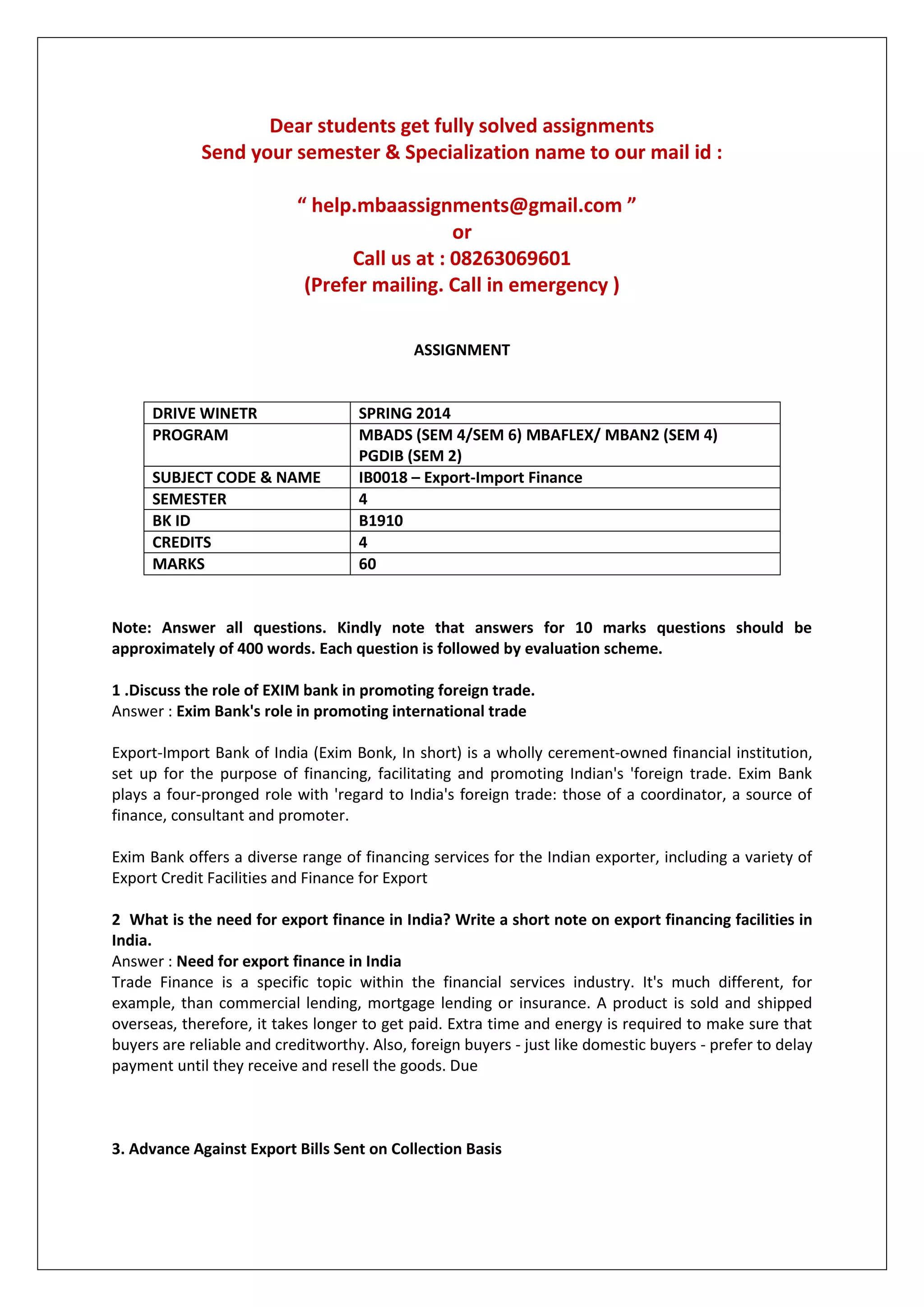 The document provides information about obtaining fully solved assignments from an assignment help service. It lists the contact email and phone number and specifies the programs, semesters, subjects, and courses for which assignments are available. It then provides a sample assignment question related to export-import finance, covering topics like the role of EXIM Bank in promoting foreign trade, export financing facilities in India, advance against export bills, export credit guarantee corporation, foreign exchange risk, payment options for exporters and importers, and types of custom duties. Students are instructed to answer all questions and provide approximately 400 word answers for 10 mark questions.