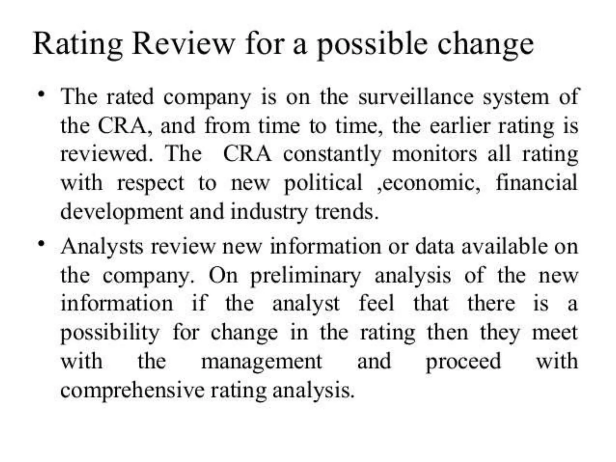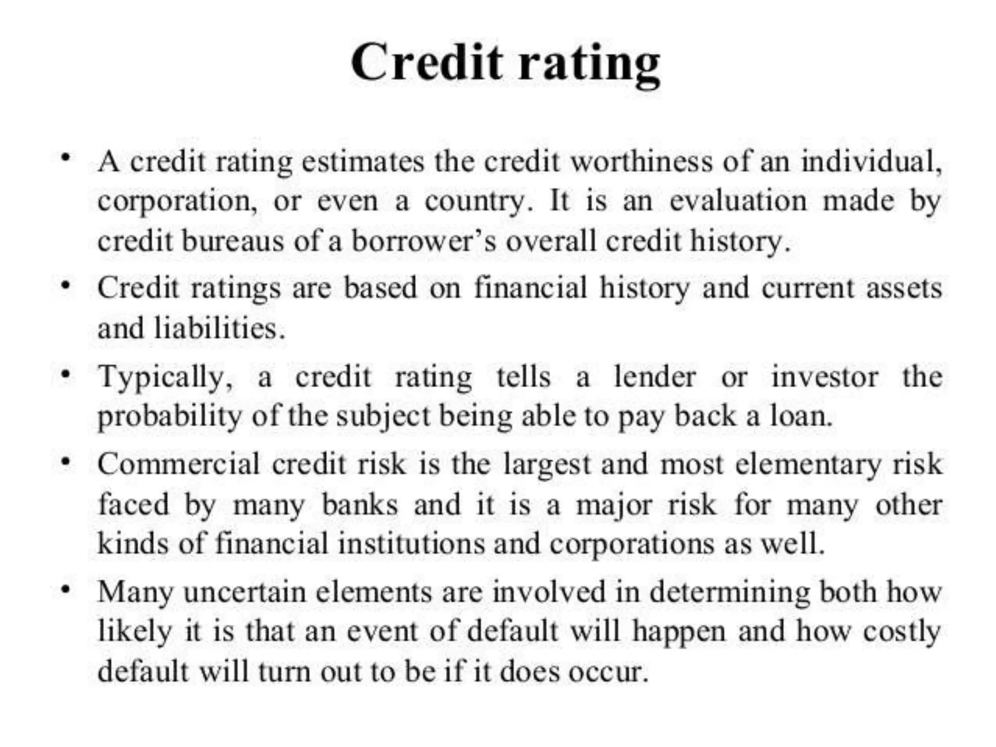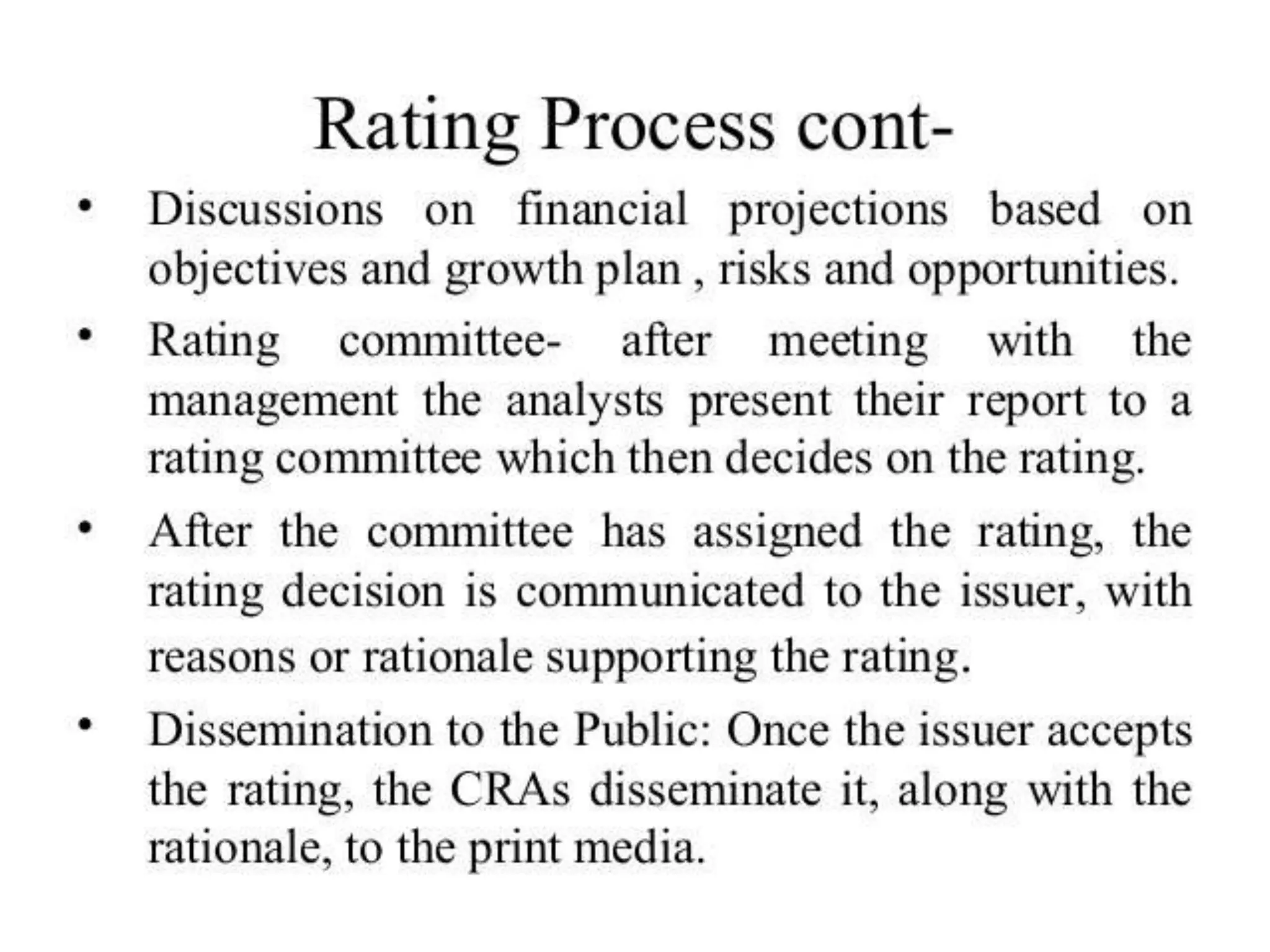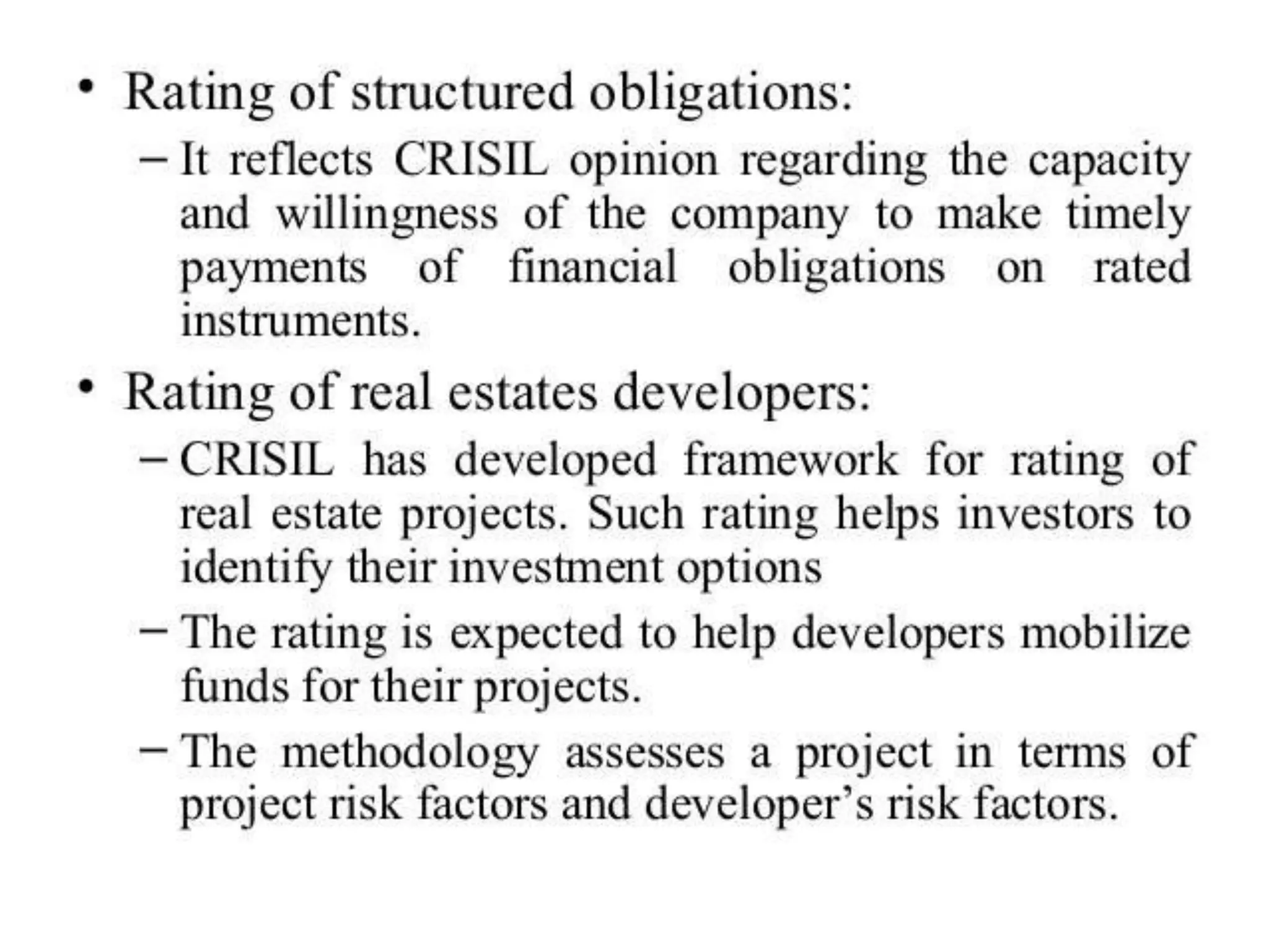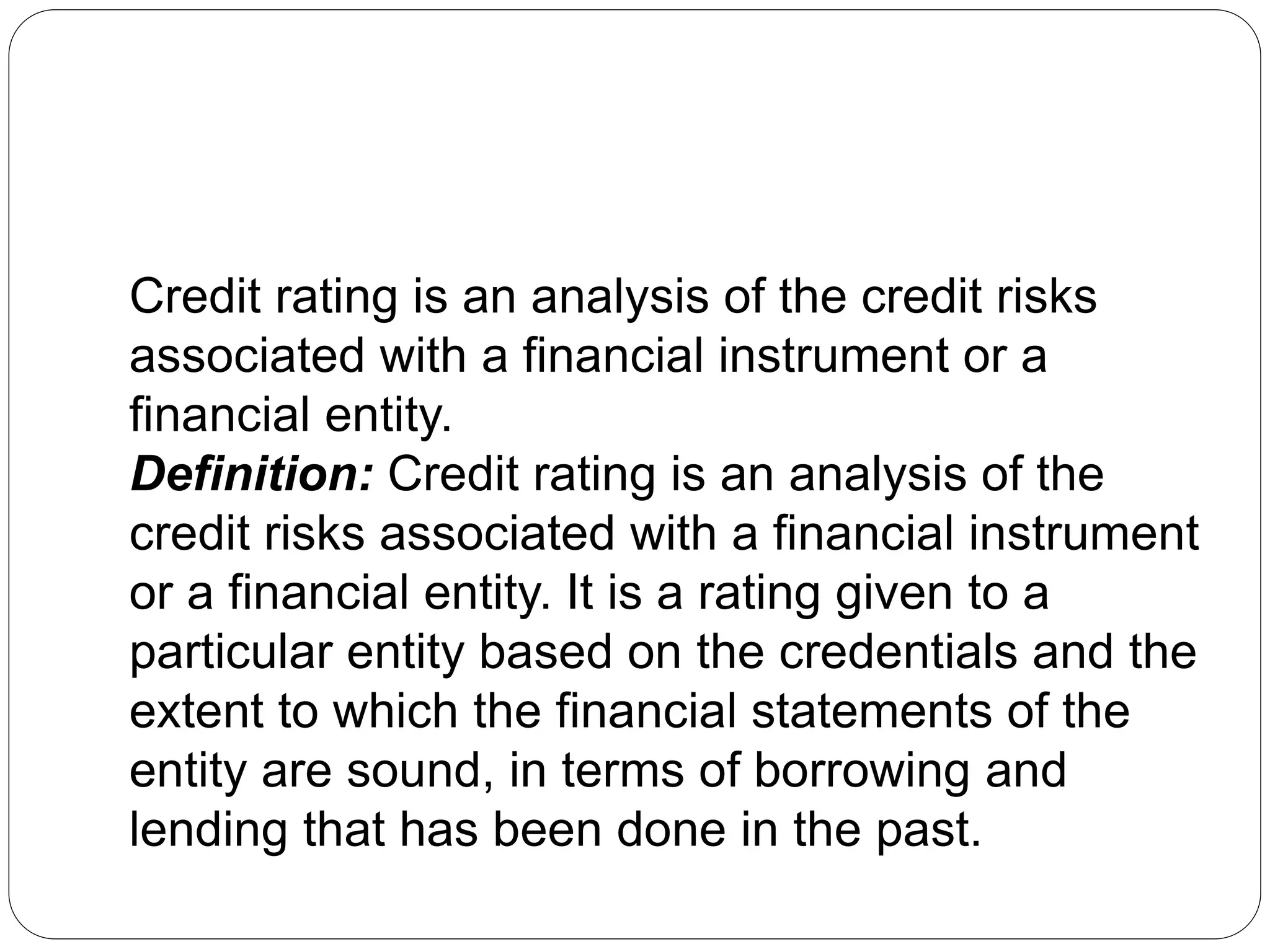 Credit rating is an analysis of the credit risks associated with a financial instrument or entity. It assesses the creditworthiness of a borrower based on their financial statements and past borrowing and lending. Credit ratings are assigned by agencies and the rated entity pays for the rating. Securitization of debt involves converting long-term illiquid assets like loans into marketable securities that can be traded, through special purpose vehicles registered with regulatory bodies. It allows lenders to enforce security interests by taking possession of collateral in the event of a default.