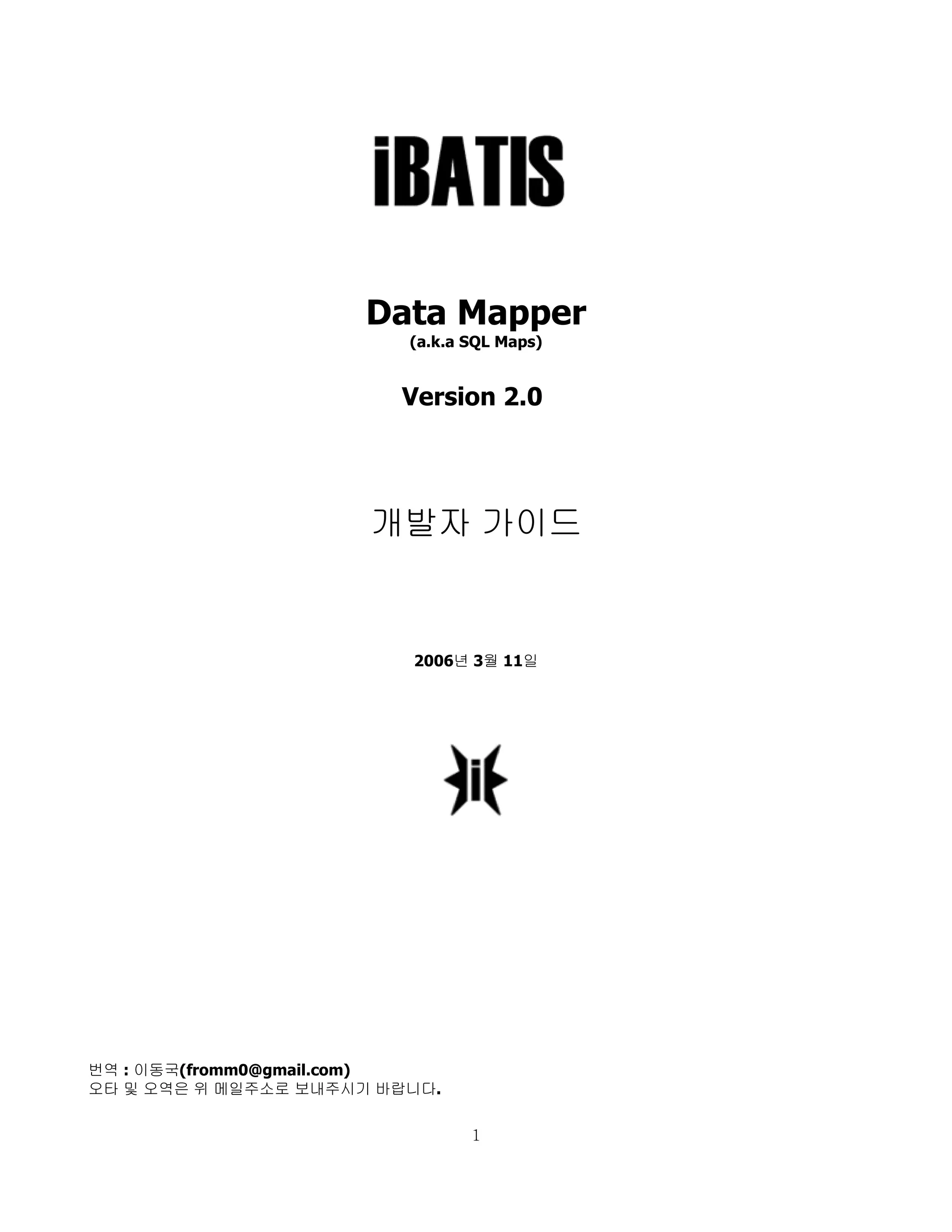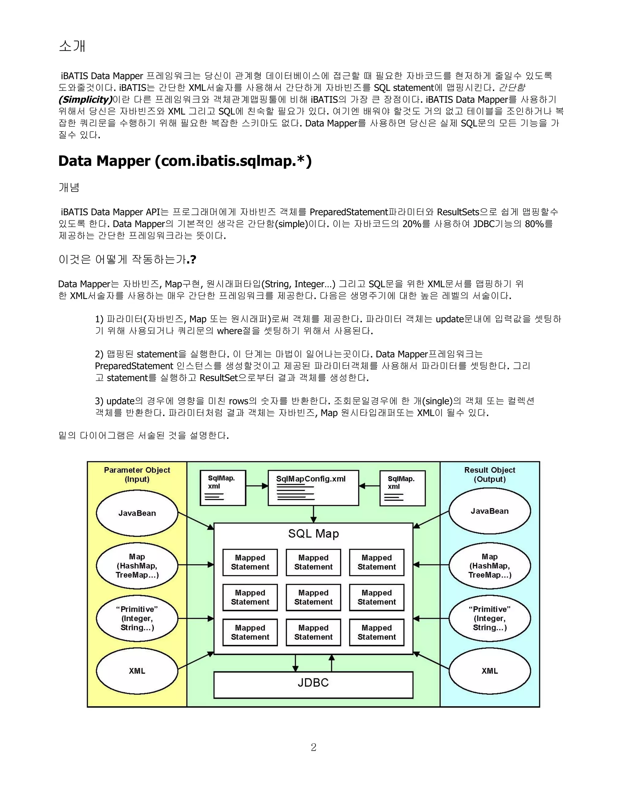 iBATIS Data Mapper API는 프로그래머에게 자바빈즈 객체를 PreparedStatement파라미터와 ResultSets으로 쉽게 맵핑할수