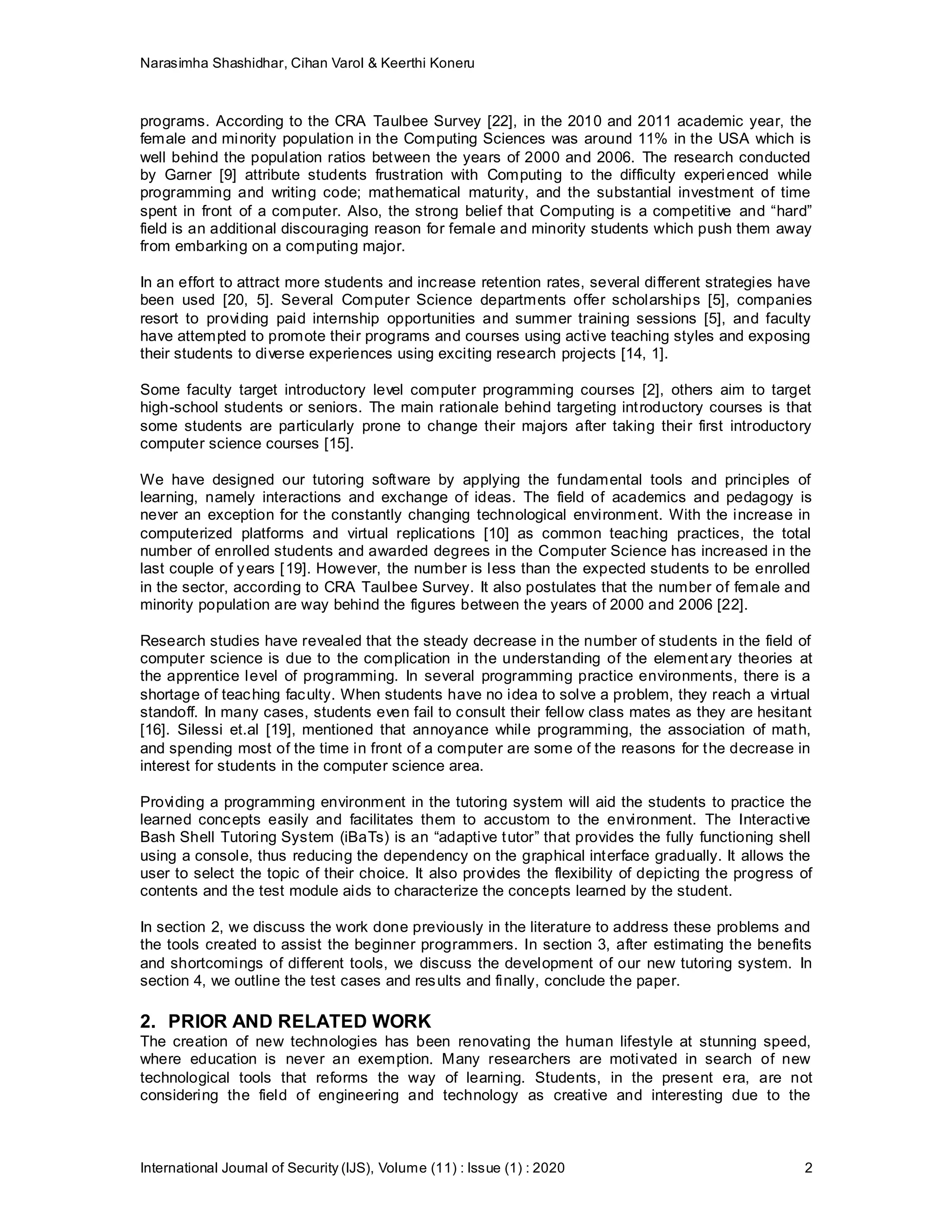 The document discusses the development of the Interactive Bash Shell Adaptive Tutoring System (IBATS), designed to help students master the console and command-line interface crucial for system and cyber security. It highlights the challenges faced by students, particularly females and minorities, in adapting to computing environments and proposes IBATS as a means to make learning engaging and adaptive, utilizing a multi-panel web-based system that combines tutorials with an interactive bash shell. The paper outlines the unique pedagogical features of IBATS, including progress tracking, quizzes, and the ability to upload new content, aiming to foster a deeper understanding of UNIX environments among novice users.