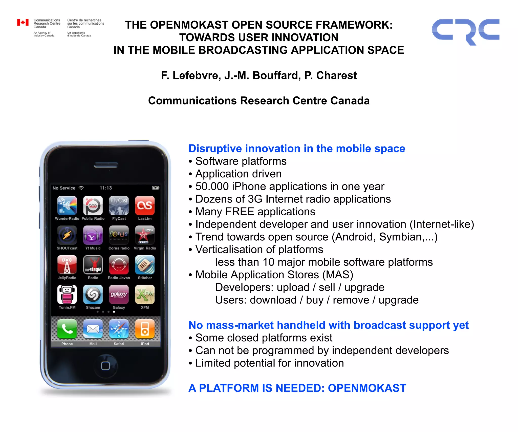 The Openmokast framework is an open-source initiative aimed at fostering user innovation in mobile broadcasting applications, launched by the Communications Research Centre Canada in 2007 and open-sourced in 2009. It supports various audio technologies and has a modular architecture to enhance device compatibility, featuring applications for Android and a focus on user-generated content. The framework seeks to catalyze innovation in broadcasting to handheld devices and offers an accessible platform for independent developers.
