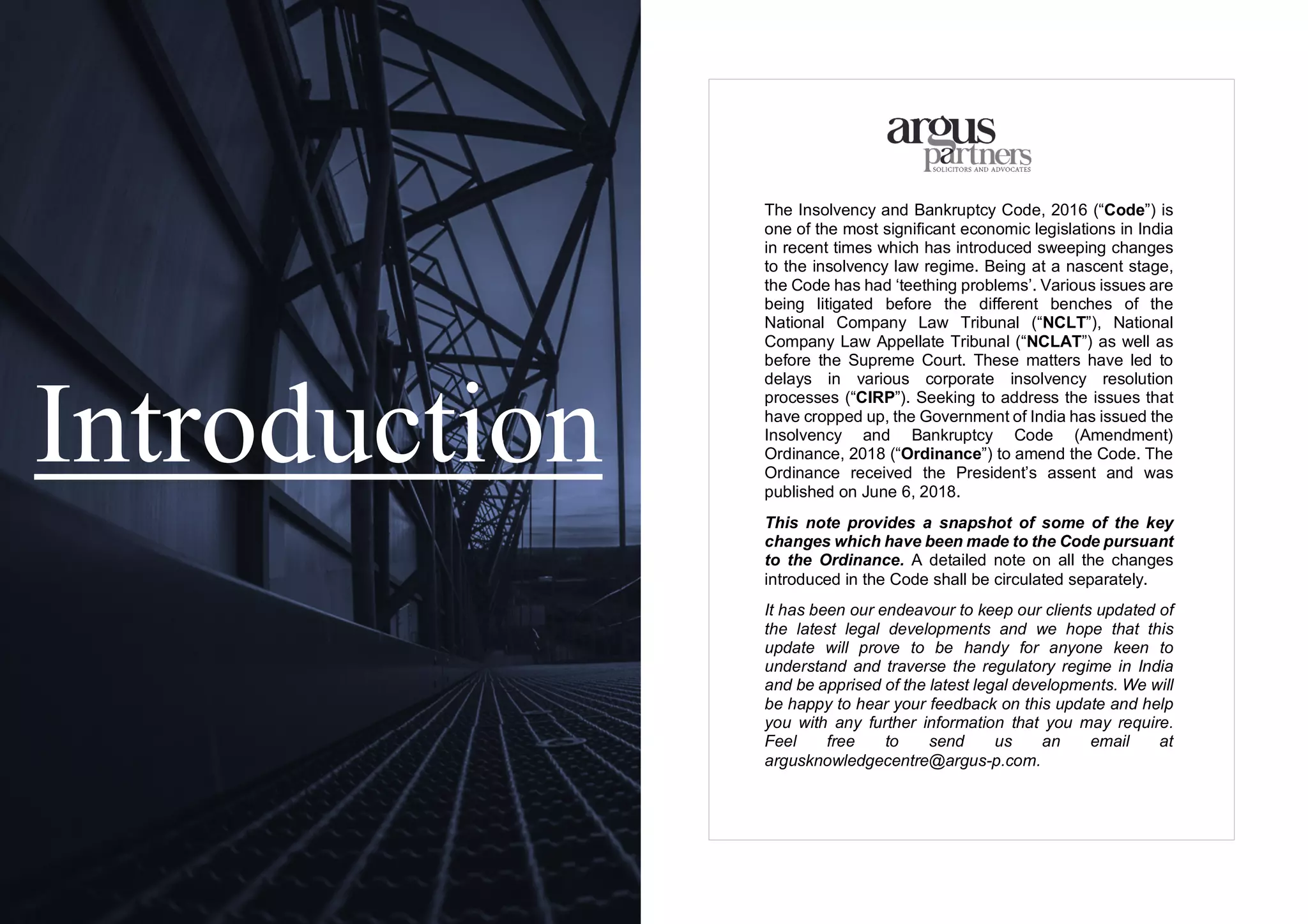 The Insolvency and Bankruptcy Code (Amendment) Ordinance, 2018 introduces several key changes to the insolvency regime in India, including recognizing home-buyers as financial creditors with rights to vote and receive liquidation proceeds. It lowers the approval threshold for resolution plans from 75% to 66% and clarifies issues regarding moratorium applicability to guarantors. Additional provisions address compliance responsibilities for resolution professionals, limitations on disqualification criteria for certain parties, and the applicability of the Limitation Act to NCLT proceedings.