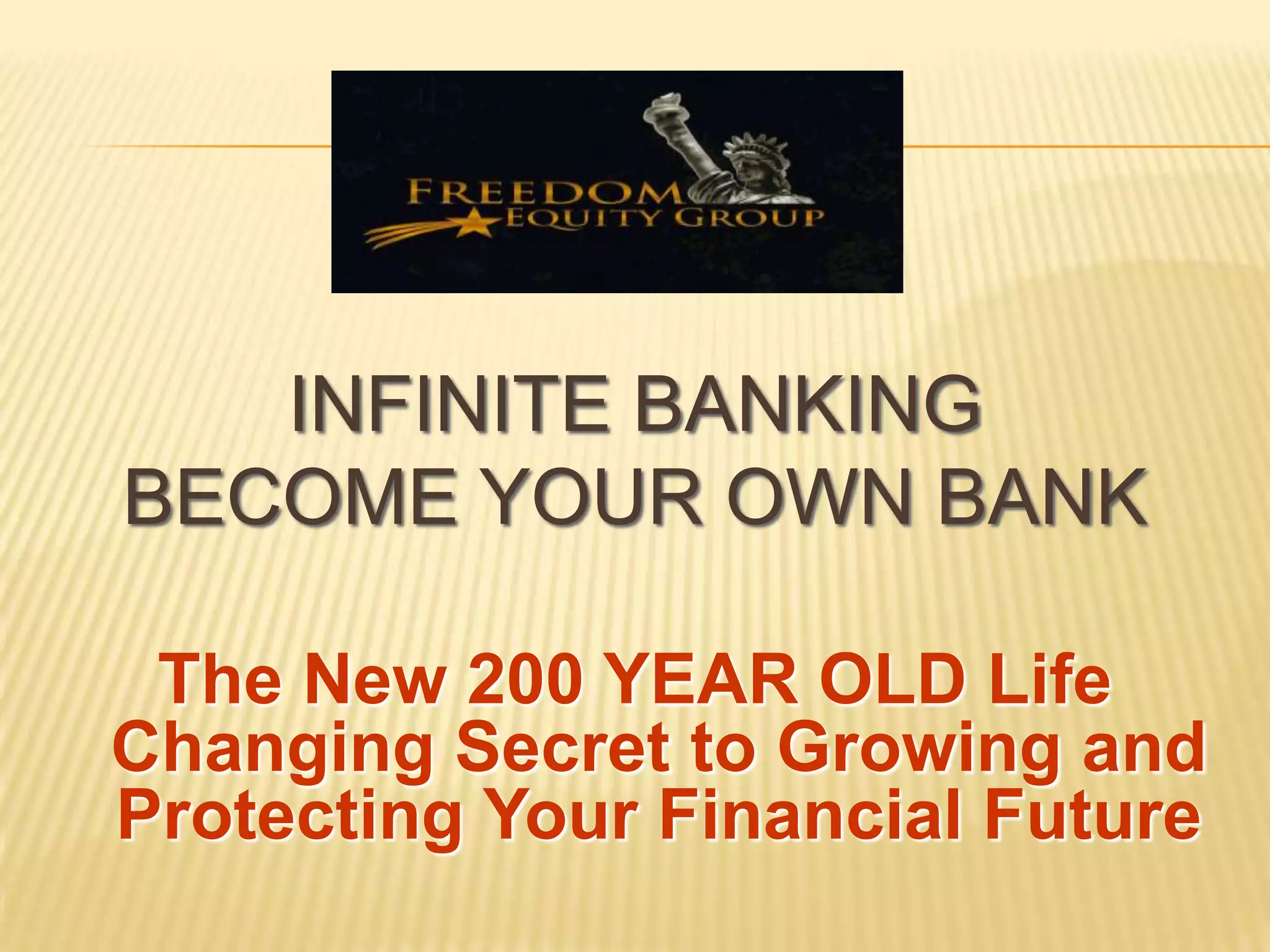 This document discusses the concept of "Infinite Banking" which is presented as a strategy for becoming your own bank through the use of whole life insurance policies. It notes some key benefits as becoming the banker, borrower, and depositor which eliminates risk and turns liabilities into assets. An illustration is provided showing how purchasing cars over 40 years through policy loans and repayments results in getting all money back plus interest earnings. The strategy is positioned as allowing one to fund major purchases like education and vacations while growing wealth over the long term in a tax-advantaged manner.