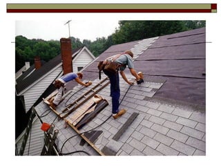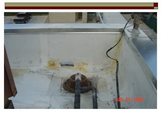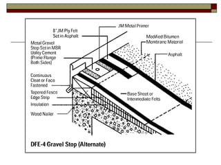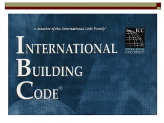 The document summarizes key sections of the International Building Code (IBC) related to commercial roofing. It defines terms used for various roofing materials and systems. It also outlines requirements for weather protection, wind resistance, fire classification, drainage, and performance of roof coverings and assemblies. Secondary roof drainage systems are required where water could become trapped, and must have separate piping from primary drainage systems.