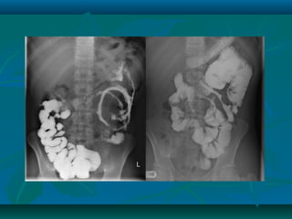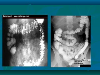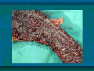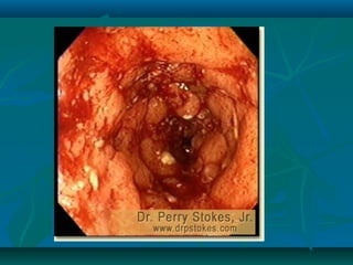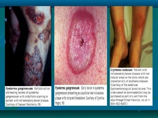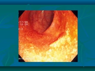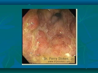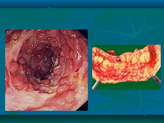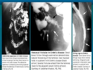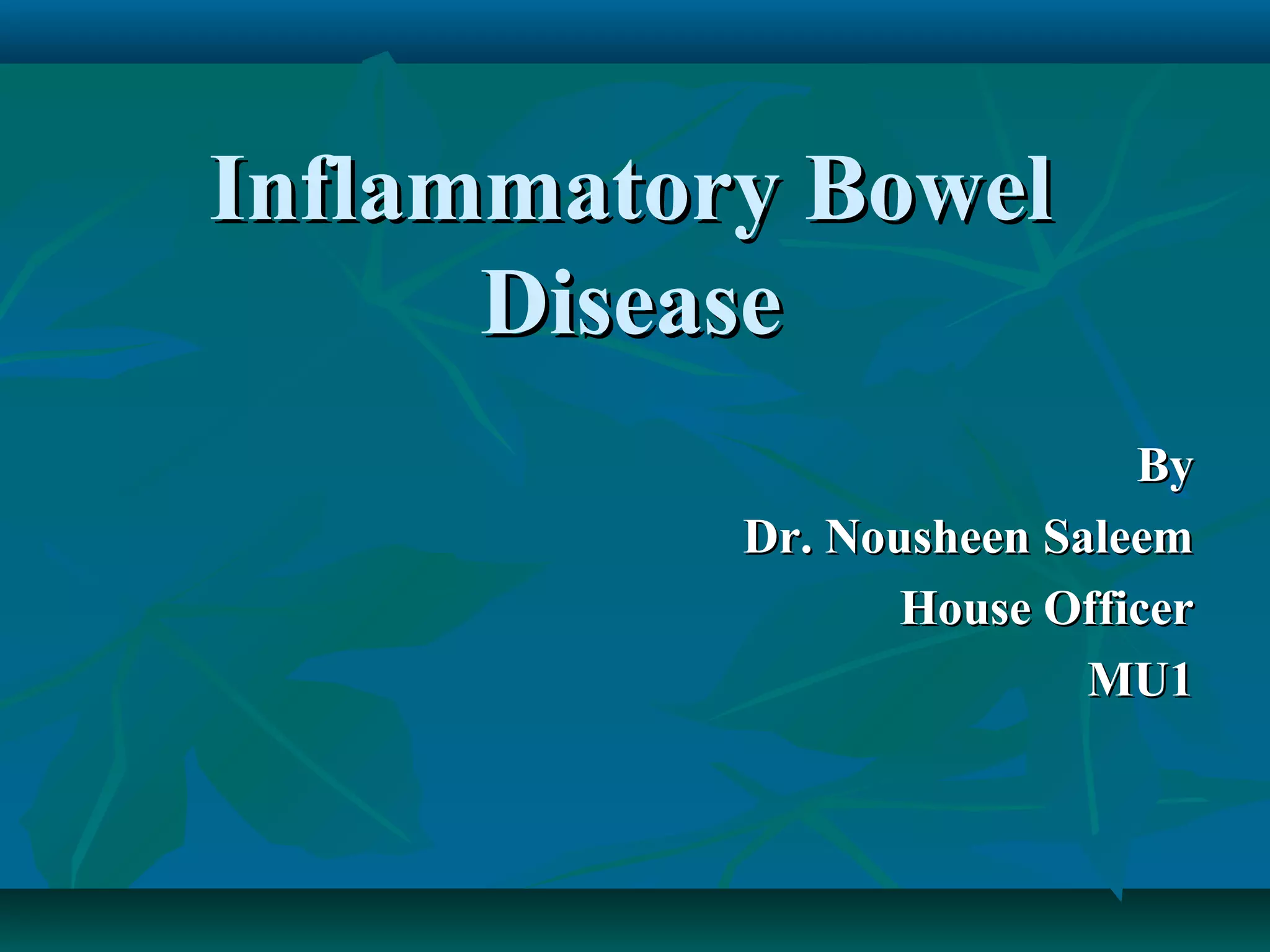 Inflammatory bowel disease refers to ulcerative colitis and Crohn's disease, which cause chronic inflammation of the intestines. Ulcerative colitis affects only the large intestine and causes ulcers, bleeding, and diarrhea. Crohn's disease can impact any part of the digestive tract and causes patchy inflammation that may lead to complications like fistulas or strictures. Both conditions are characterized by periods of remission and relapse of symptoms. Their causes are unknown but involve genetic and environmental factors. Diagnosis involves medical history, physical exam, blood tests, endoscopy, and imaging.