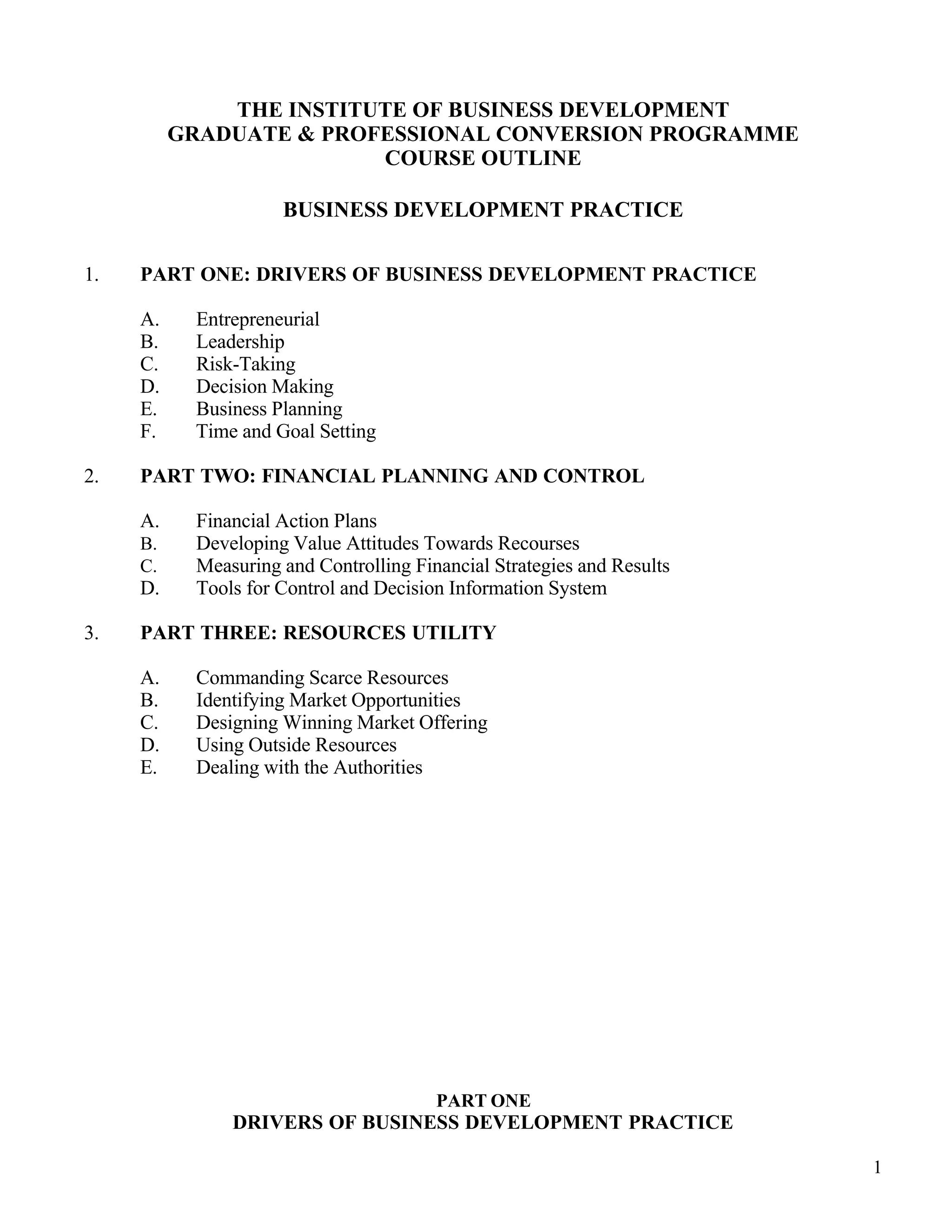 The document outlines the course for a Graduate & Professional Conversion Programme in Business Development Practice. The course is divided into three parts that cover the drivers of business development including entrepreneurship, leadership and planning; financial planning and control tools; and utilizing resources to identify market opportunities and design competitive offerings.