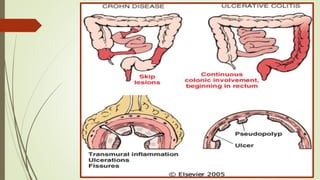 The document discusses inflammatory bowel disease (IBD), which includes ulcerative colitis and Crohn's disease. IBD is characterized by chronic inflammation of the bowel that can affect any part of the gastrointestinal tract from mouth to anus. Common symptoms include abdominal pain, diarrhea, and weight loss. Treatment involves medications to reduce inflammation as well as surgery in severe cases to remove inflamed sections of bowel. Complications can include malnutrition, infection, bowel obstruction, and in rare cases colon cancer. The causes of IBD are not fully understood but involve an abnormal immune response in the gastrointestinal tract.