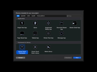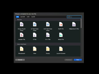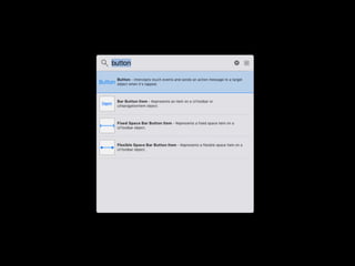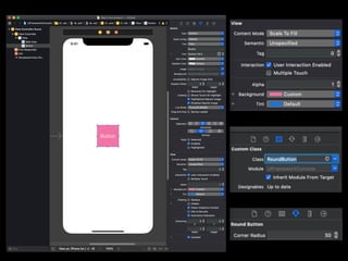 This document discusses using @IBDesignable to design user interfaces in Interface Builder. It explains that @IBDesignable allows custom UI classes to be rendered in Interface Builder by compiling code when a storyboard or XIB file is opened. It also describes how to define an @IBDesignable class to add a cornerRadius property to a round button that updates its layer in draw(), and discusses some limitations of using @IBDesignable like increased compilation time.