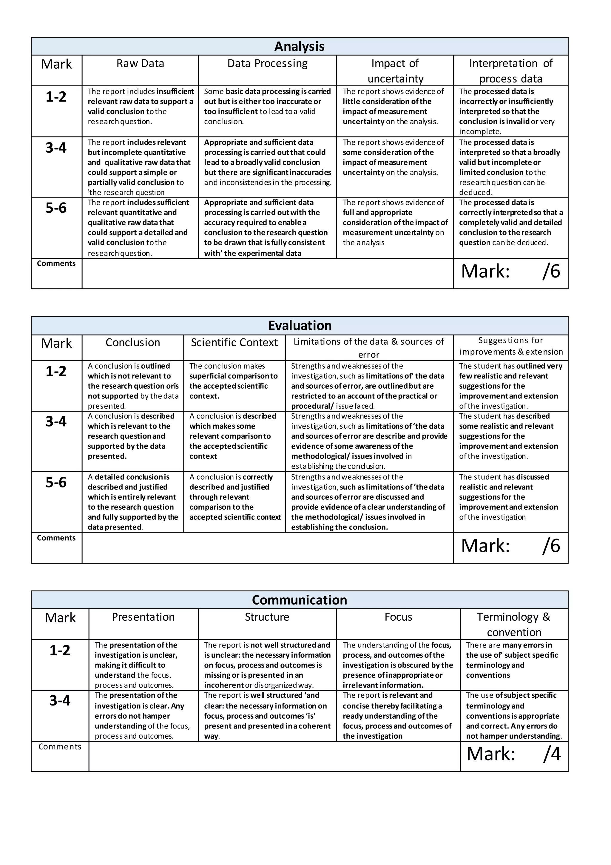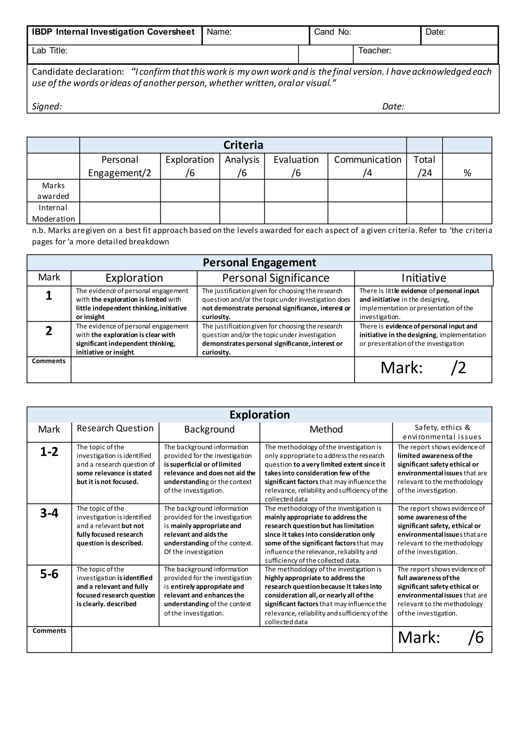 The document outlines the criteria for evaluating a candidate's investigation in various fields, including personal engagement, exploration, analysis, evaluation, and communication, with specific scoring guidelines for each. It details the benchmarks for acceptable performance, emphasizing the importance of personal significance, methodological rigor, and clarity in presentation. Additionally, it provides a framework for identifying and addressing uncertainties and sources of error in scientific investigations.