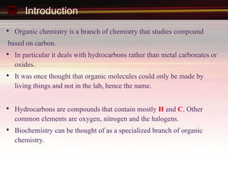 This document provides an introduction to organic chemistry, focusing on hydrocarbons. It defines organic chemistry as the study of carbon-based compounds, particularly hydrocarbons rather than metal carbonates or oxides. There are four main classes of hydrocarbons discussed: alkanes, alkenes, alkynes, and aromatics. Alkanes contain only single bonds, while alkenes contain double bonds and alkynes contain triple bonds. Functional groups are discussed, which determine the physical and chemical properties of organic compounds. Homologous series are introduced as families of compounds that differ by CH2 units and have similar properties.