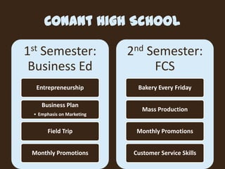 Conant High School's 1st semester includes business education with a focus on entrepreneurship and bakery operations, featuring a soft opening for 'Cougar Perk' on January 20. The menu includes coffee and baked goods priced at $0.50, with special introductory pricing. A family and friends event is scheduled for February 26 in the faculty cafeteria.