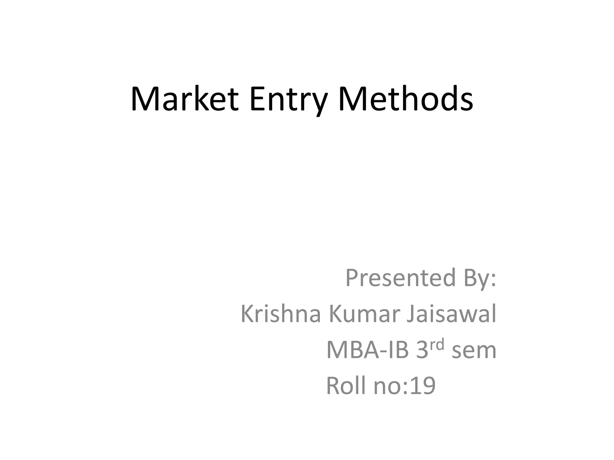 This document discusses various methods for companies to enter foreign markets. It describes options ranging from low-risk contractual arrangements like indirect exports, licensing, and contract manufacturing to higher-risk/control options like joint ventures and wholly owned foreign subsidiaries. For each option, it provides details on characteristics, requirements, and examples. The key factors that companies should analyze in choosing a market entry strategy are the level of control, financial commitment, and risk associated with each alternative.