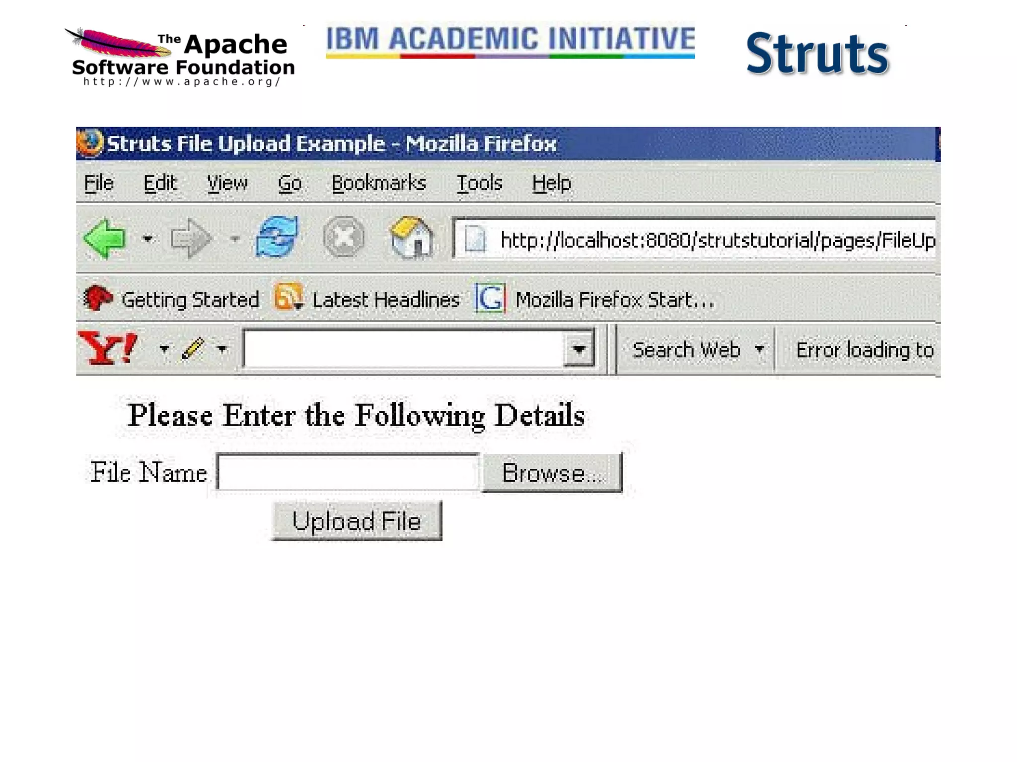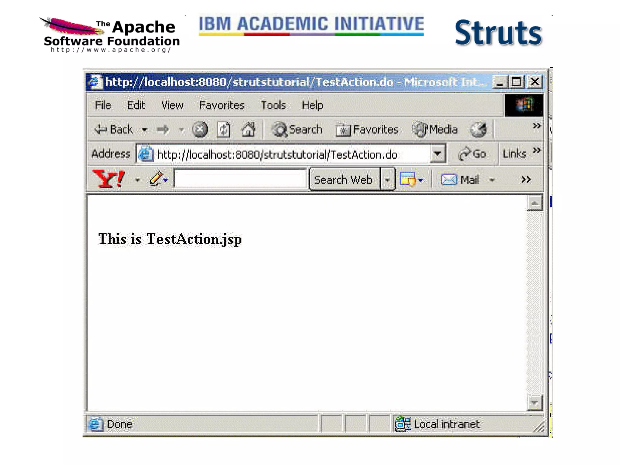 The document discusses setting up a development environment for Java web applications using frameworks like Struts, including installing Java, Tomcat, and Struts. It also provides an overview of developing a basic "Hello World" Struts application, including creating an action class and configuring it in the struts.xml file to return the view page. The document includes code samples for configuring filters in web.xml and implementing a basic action class and JSP view page.
