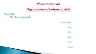 The document discusses the organizational culture at IBM, describing characteristics such as treating all employees equally, hiring employees for life, encouraging education and promotion from within. It also outlines some of IBM's fundamental principles established by Thomas Watson, and how the company has adapted its culture over time to remain competitive in a changing market.