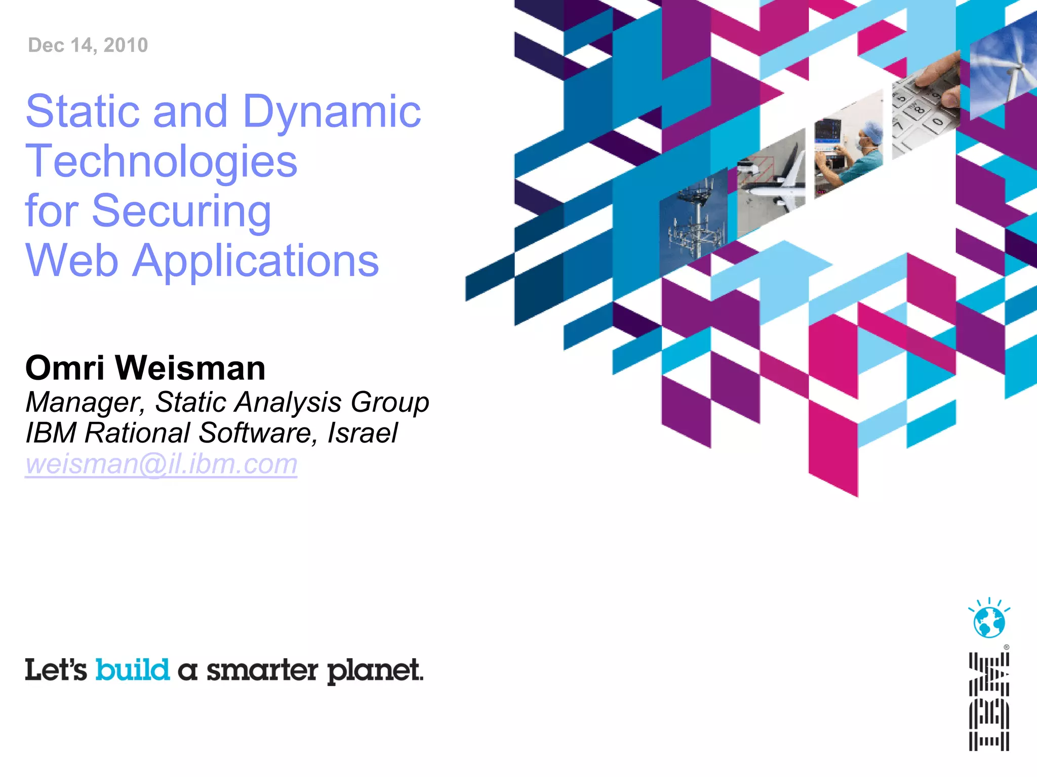The document discusses static and dynamic technologies for securing web applications. It notes that web application vulnerabilities represented the largest category of disclosed vulnerabilities in 2009. The root causes of these vulnerabilities are identified as lack of security training for developers, underinvestment in security from organizations, and increased complexity of mission critical online applications. Both static (white box) and dynamic (black box) security testing approaches are described, with their respective strengths and weaknesses discussed. The document argues that combining static and dynamic analysis can provide the greatest accuracy in identifying potential security issues.