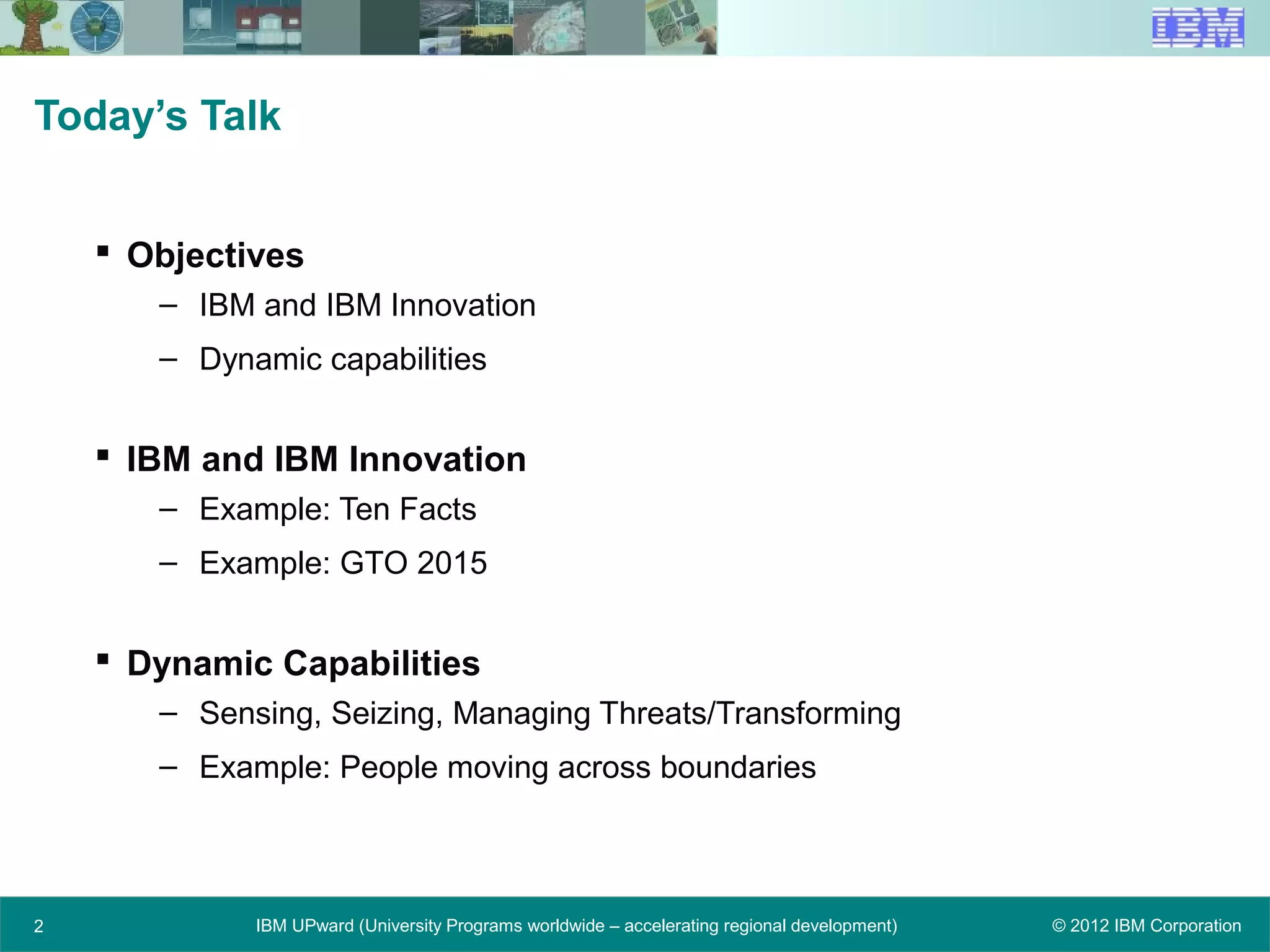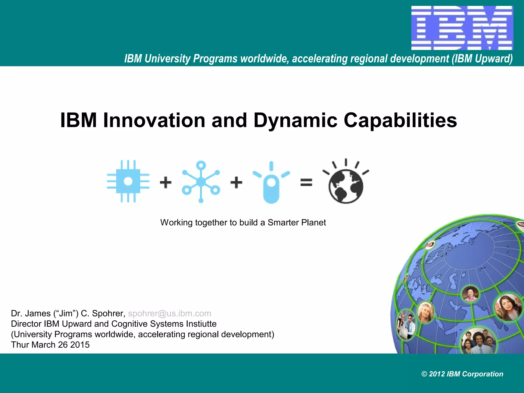 IBM's University Programs work to accelerate regional development through partnerships with universities worldwide. The document discusses IBM's innovation capabilities and how they are dynamic. It provides examples of how IBM senses opportunities, seizes them, and manages threats and transformation.