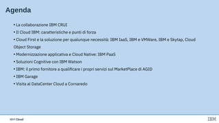 Il documento descrive le offerte e le funzionalità della piattaforma IBM Cloud, evidenziando la sua sicurezza, flessibilità e capacità di supportare soluzioni multicloud e hybrid cloud. Viene menzionata l'infrastruttura globale di IBM, i servizi disponibili e il potenziale per modernizzare l'IT aziendale attraverso l'adozione di tecnologie AI e cognitive. Infine, si pone l'accento sulla collaborazione tra IBM e VMware per facilitare la gestione delle soluzioni cloud ibrido.