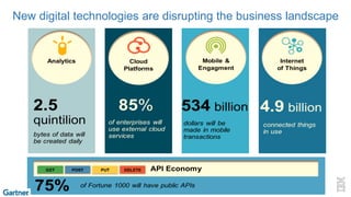 This document discusses IBM's hybrid integration reference architecture for digital transformation. It describes how new digital technologies are disrupting businesses and requiring companies to find new ways to innovate, reach, and engage customers. It introduces Systems of Record (SoR), Systems of Engagement (SoE), and Systems of Interaction (SoI) as the new IT systems paradigm that can transform operations and business models. It also summarizes three primary trends driving the integration market: integration being adopted in lines of business, increasing need to integrate across hybrid environments, and the API economy and microservices.