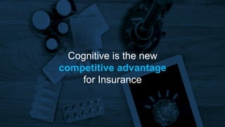 This document discusses how cognitive computing using IBM Watson can transform various areas in the insurance industry by going beyond traditional predictive analytics. It provides examples of how Watson can be used for underwriting advisors, wealth advisors, customer self-service virtual agents, claims adjusting, and other areas. Watson understands natural language, generates hypotheses, and learns as it analyzes large amounts of structured and unstructured data. This allows it to help insurance professionals make more informed decisions.