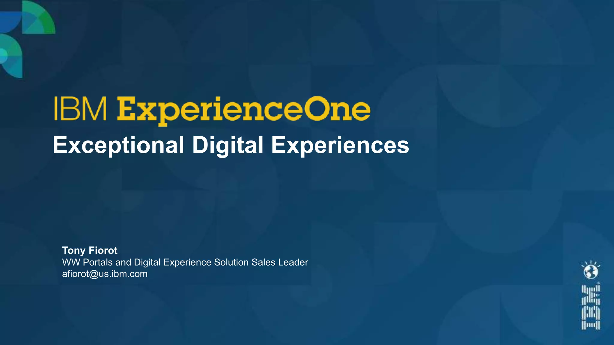 IBM's digital experience software helps organizations deliver exceptional digital experiences across all channels. It provides tools to create engaging and personalized experiences for customers, employees and partners. The software integrates analytics to help understand customer behavior and optimize digital properties. It also integrates with marketing solutions to enable personalized interactions across touchpoints.