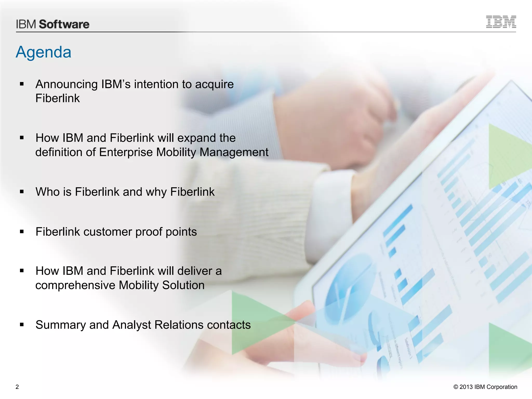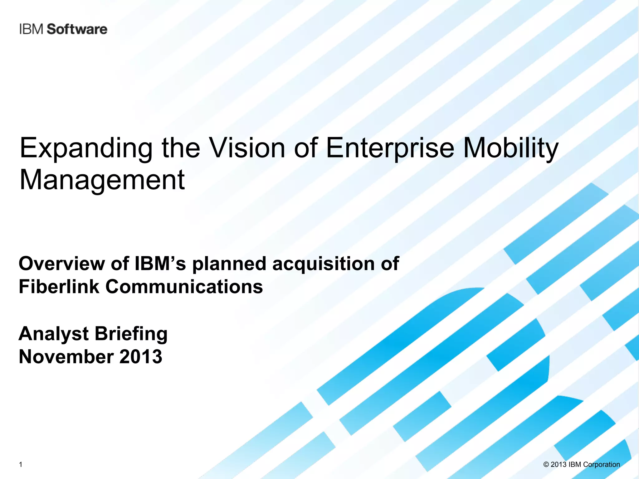 IBM plans to acquire Fiberlink to enhance its enterprise mobility management solutions, allowing organizations to securely manage various mobile devices, applications, and content. Fiberlink, a leader in mobile management since 1991, offers comprehensive solutions including mobile application management and secure document sharing, aimed at improving productivity and security for enterprises. This acquisition will integrate Fiberlink’s capabilities with IBM's MobileFirst strategy, providing a unified platform for mobile device management and security.