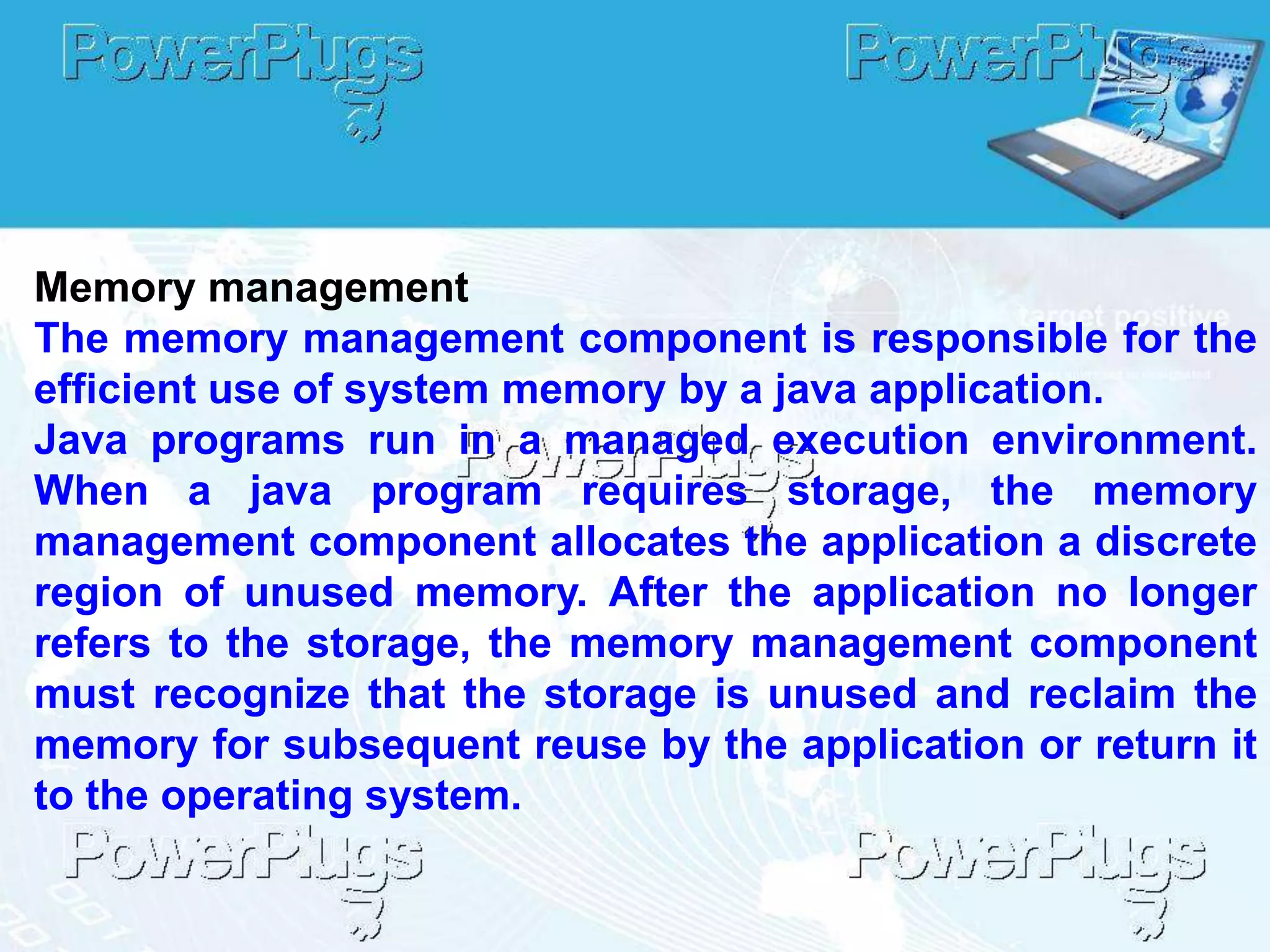 The document discusses IBM's memory management for Java applications. Memory management allocates discrete regions of unused memory to applications and reclaims memory when it is no longer being used. On IBM systems, memory management uses temporary dynamic memory like single-level storage and teraspace, as well as undefined memory mapped files for extended memory. Teraspace provides 1 terabyte address spaces for processes using separately allocated storage areas that can have addressability holes. Memory mapped files map storage areas to undefined files in the file system, redirecting memory access to file access.
