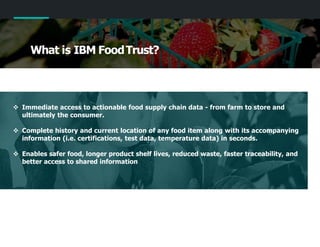 IBM Food Trust is a blockchain solution designed to enhance transparency and safety in the food supply chain, providing immediate access to detailed data about food items from farm to consumer. It enables faster traceability, reduces food waste, and ensures authenticity through a permissioned system that manages and secures data. The solution addresses various challenges faced by supply chain stakeholders, promoting efficiency and trust across the food ecosystem.