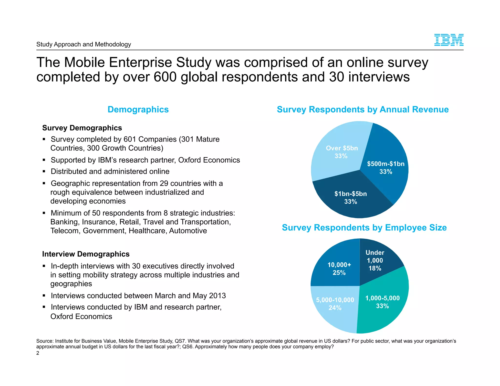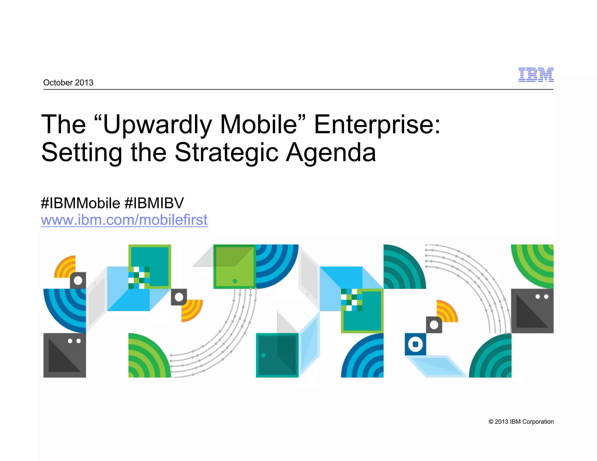 This document summarizes key findings from a study conducted by IBM on organizational mobility strategies and practices. The study was comprised of an online survey of over 600 respondents and 30 interviews. It found that leading organizations see mobility as fundamentally changing how business is done. These leaders have seen measurable returns from mobile initiatives and place greater importance on supporting employee productivity through mobile capabilities like monitoring and collaboration tools. To drive productivity, many leaders embrace bring-your-own-device policies and provide necessary training and support for employees using mobile devices. While data analysis remains a challenge for many, the most effective organizations have truly focused on applying analytics to gain insights from mobile data.