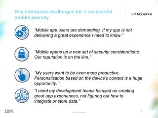 The IBM MobileFirst platform addresses key challenges in mobile app development by focusing on user experience, security, and scalability. It enables rapid app development cycles, integrates data from multiple sources, and provides tools for user feedback and authentication. The platform supports both hybrid and native app development while ensuring data security and continuous improvement through modular services and comprehensive analytics.