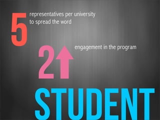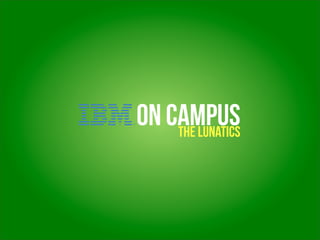 The document outlines plans for a university partnership program with IBM. It discusses objectives to register 30 universities within 5 years and become a top 100 employer. Personas of potential student and faculty partners are described. The plan proposes new objectives around research awards, software downloads and campus representatives. It introduces challenges to promote collaboration and real-world problem solving. New global strategies include branding, student competitions and faculty grants. Performance metrics focus on promotional activities and challenge participation levels.