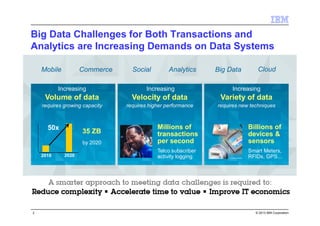 The document describes IBM's PureData System for Analytics N200x, a new model that provides faster performance for big data analytics through improvements like more CPU cores, faster FPGAs, and more disk drives per server blade. The N200x offers 3x faster query performance than previous models, improved data center efficiency through 50% greater data capacity per rack, and fewer service calls expected through more frequent drive regeneration.