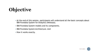 The document provides information about the IBM PureData System for Analytics (Netezza). It discusses the components and architecture of the IBM PureData System models, including the N1001 and N2001 models. It explains the key hardware components like snippet blades, hosts, and storage arrays and how they work together using Netezza's Asymmetric Massively Parallel Processing architecture to optimize analytics workloads.
