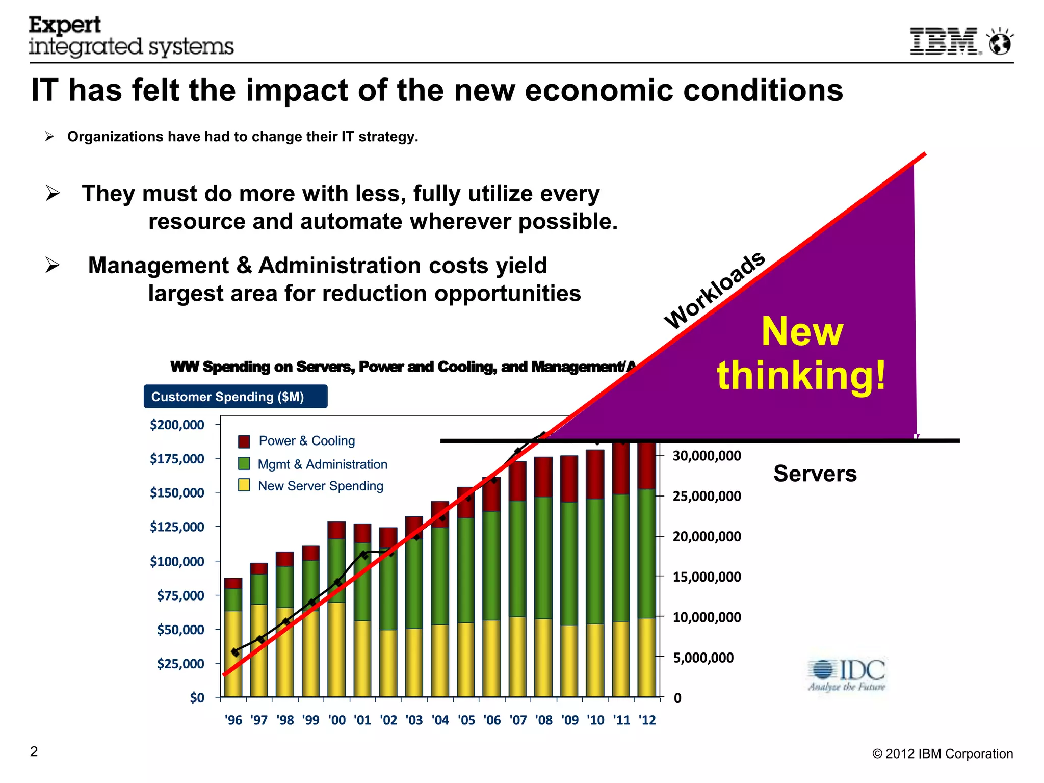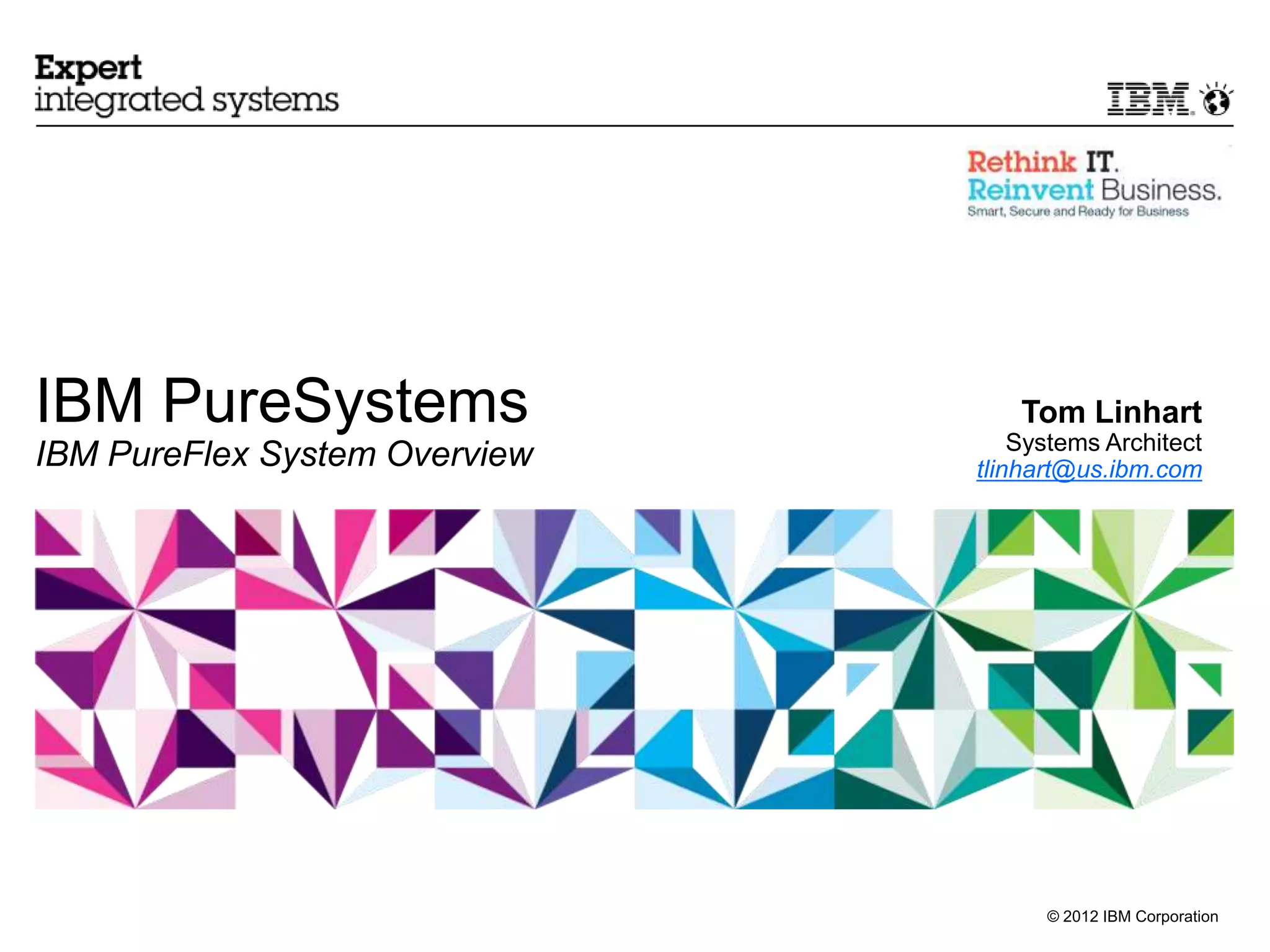 This document provides an overview of the IBM PureFlex System. It discusses how IT strategies have had to change to do more with less resources. It introduces the IBM PureSystems family which includes the Infrastructure System and Platform System. These systems are pre-configured, pre-integrated and optimized with integrated expertise to simplify management and provide automation. The document then focuses on the IBM PureFlex System which is integrated by design with compute, storage, networking, virtualization and management capabilities in a single system.