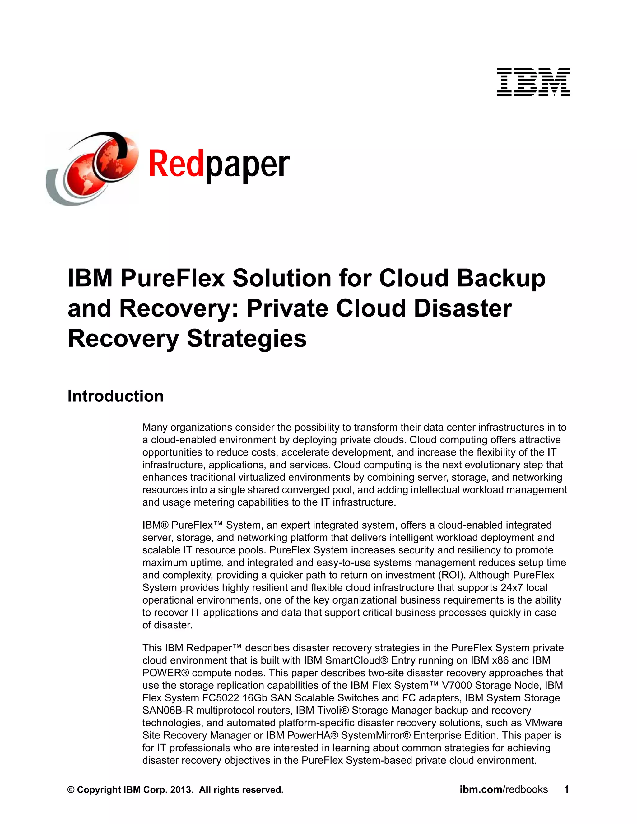 The document discusses IBM's PureFlex solution for private cloud disaster recovery strategies, emphasizing its advantages in terms of cost reduction, flexibility, and resiliency. It outlines how the PureFlex system integrates servers, storage, and networking resources while offering automated management and disaster recovery capabilities. The paper also details the infrastructure components and configurations that support efficient recovery of IT applications and data in the event of a disaster.
