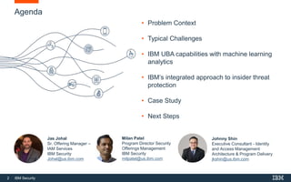 This document discusses IBM's QRadar User Behavior Analytics product for detecting insider threats and risks. It provides an agenda for the presentation which includes discussing challenges around insider threats, IBM UBA capabilities using machine learning, and IBM's integrated approach to insider threat protection. It also includes a case study example of how IBM implemented its solution for a global pharma client to help address concerns around the impact of a major reorganization on employee morale.
