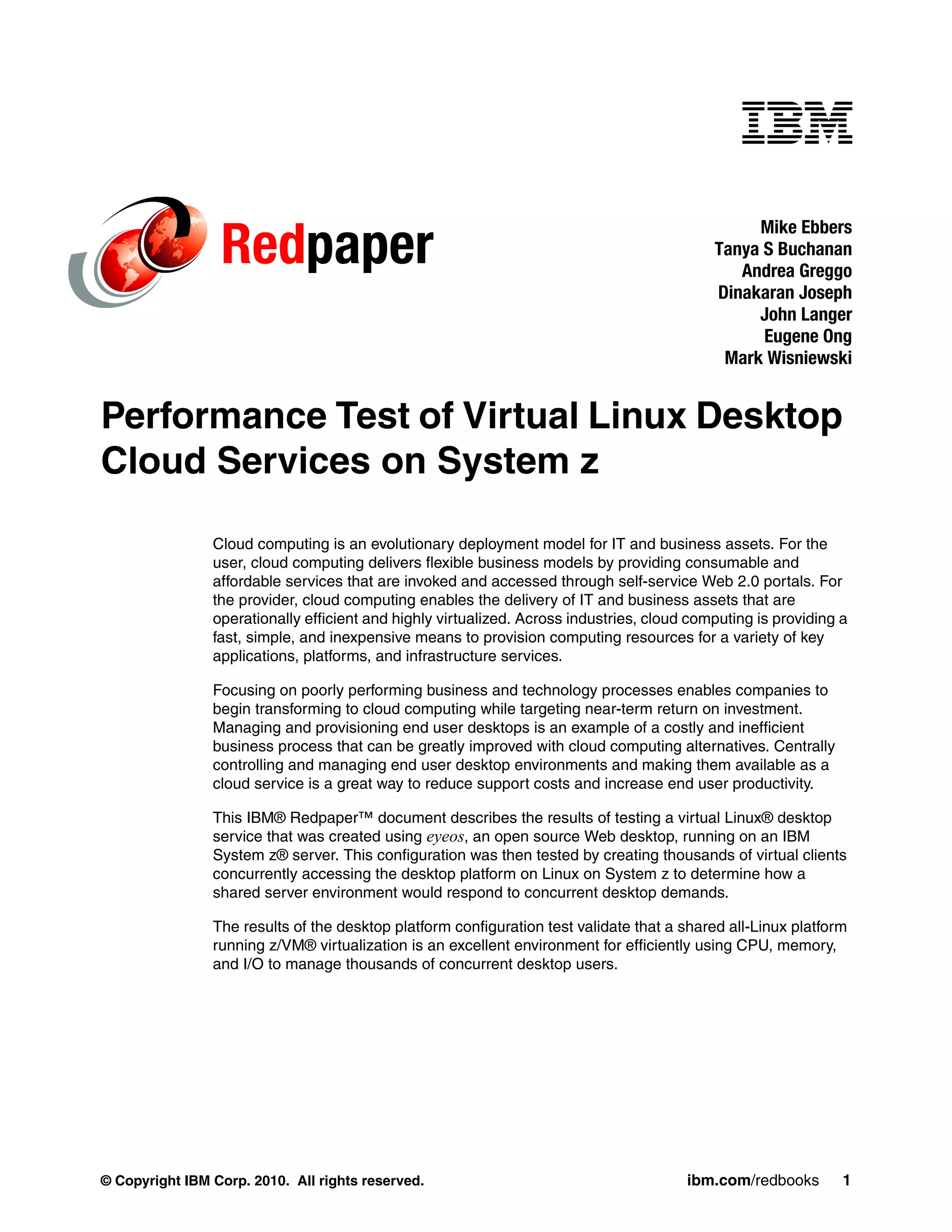 This document summarizes performance testing of a virtual Linux desktop cloud service running on an IBM System z server. Thousands of virtual desktop clients were able to concurrently access an eyeos open source web desktop platform running on Linux on System z. The results validate that a shared all-Linux platform using z/VM virtualization can efficiently support thousands of concurrent desktop users using CPU, memory, and I/O resources. Rational Performance Tester was used to simulate users accessing files and browsing web pages from their virtual desktops to test the scalability and response times of the System z configuration.