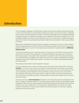 This document discusses key technology trends impacting the retail industry in 2016, as identified by IBM. It covers four main dynamics of transformation: analytics, cloud computing, mobile and social engagement, and security. Analytics and cognitive computing allow retailers to gain insights from big data to personalize customer experiences. Cloud computing enables speed, agility and flexible infrastructure upgrades. Mobile and social technologies connect retailers with customers in real-time and on-the-go. Security is a growing concern as data volumes increase and attack sophistication rises. The document provides an overview of IBM solutions that address these trends, such as analytics platforms, cloud services, and security offerings to help retailers adapt to ongoing disruption and digital transformation in retail.