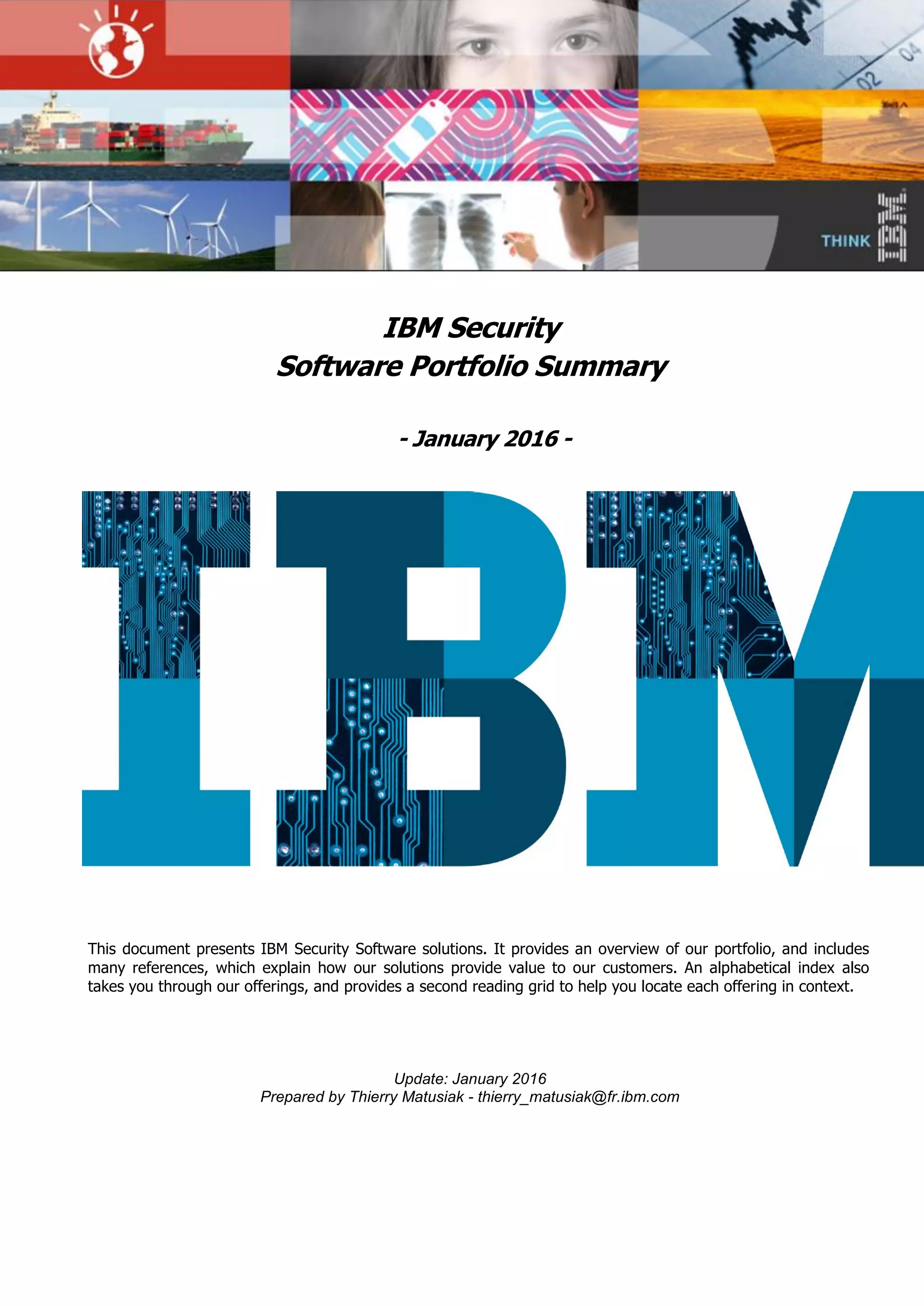 The document provides an overview of IBM's security software solutions as of June 2016, detailing the portfolio's offerings and how they add value for customers. It emphasizes security across infrastructure, user identities, data, and applications, while showcasing integrated solutions for managing threats, compliance, and operational efficiency. The document includes various resources and acknowledgments from the IBM security technical community.
