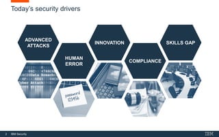 IBM's security strategy focuses on providing integrated security solutions to address modern security challenges posed by compliance needs, human error, skills gaps, and advanced attacks. IBM's portfolio includes security transformation services, security operations and response, and information risk and protection solutions. The company aims to help customers optimize their security programs, orchestrate defenses throughout the attack lifecycle, and keep critical information protected.