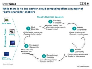 Sorin Visan is the Director of IBM Software in Romania. The document discusses how cloud computing offers several advantages for businesses including scalability, cost flexibility, and adaptability. It also discusses how governments and public sector organizations can take advantage of the cloud to innovate citizen services, collaborate more effectively, and transform core operations. Finally, the document outlines IBM's SmartCloud Solutions portfolio and capabilities around accelerating business processes, delivering analytics, and enabling collaborative networks.