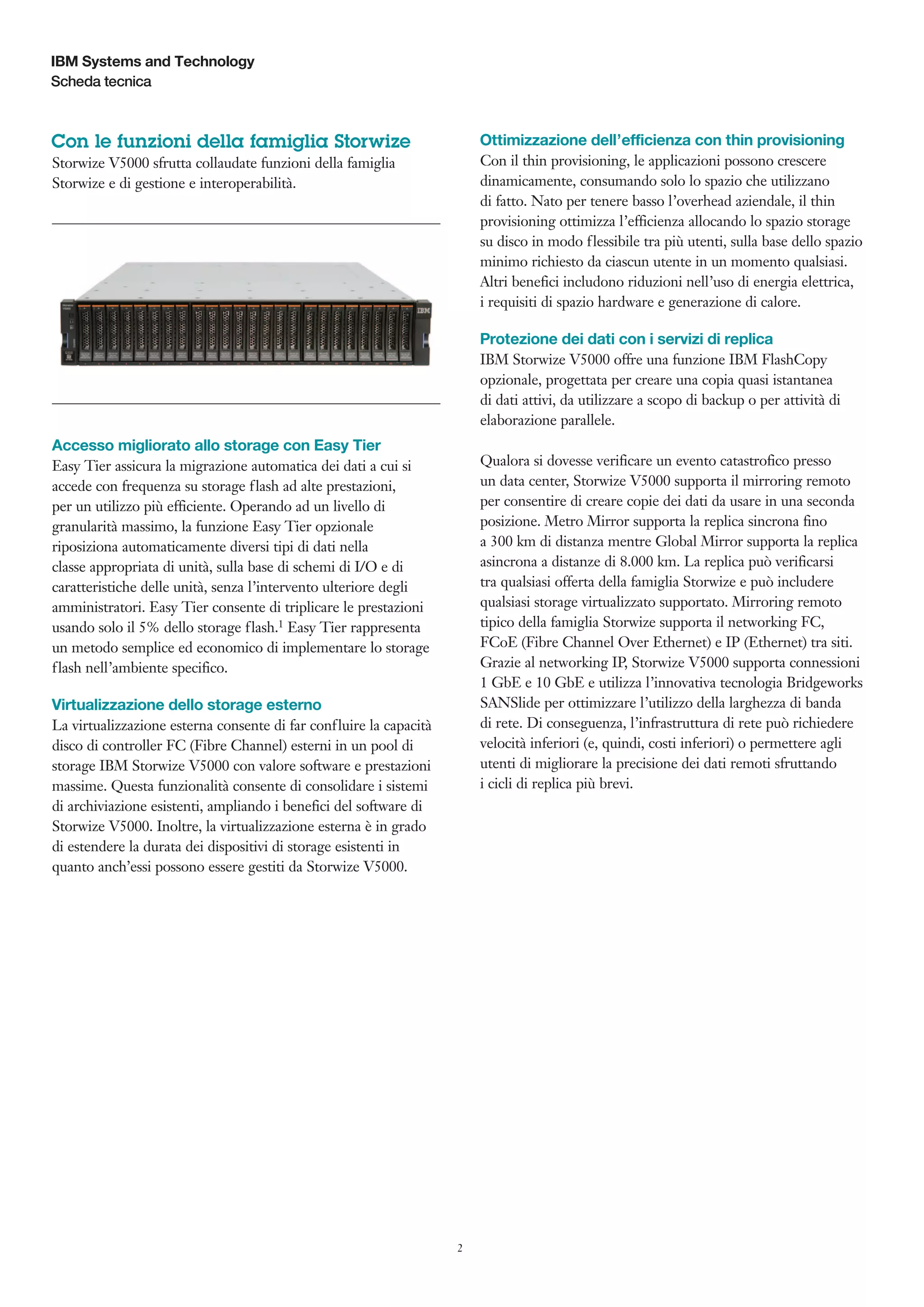 L'IBM Storwize V5000 è un sistema di storage disk con prestazioni elevate e flessibilità, progettato per consolidare infrastrutture esistenti e supportare ambienti definiti da software. Offre funzionalità avanzate come il thin provisioning, mirroring remoto e la virtualizzazione esterna, permettendo una gestione semplificata e scalabilità. È particolarmente indicato per organizzazioni di medie dimensioni, ottimizzando l'uso di risorse e migliorando l'efficienza operativa.