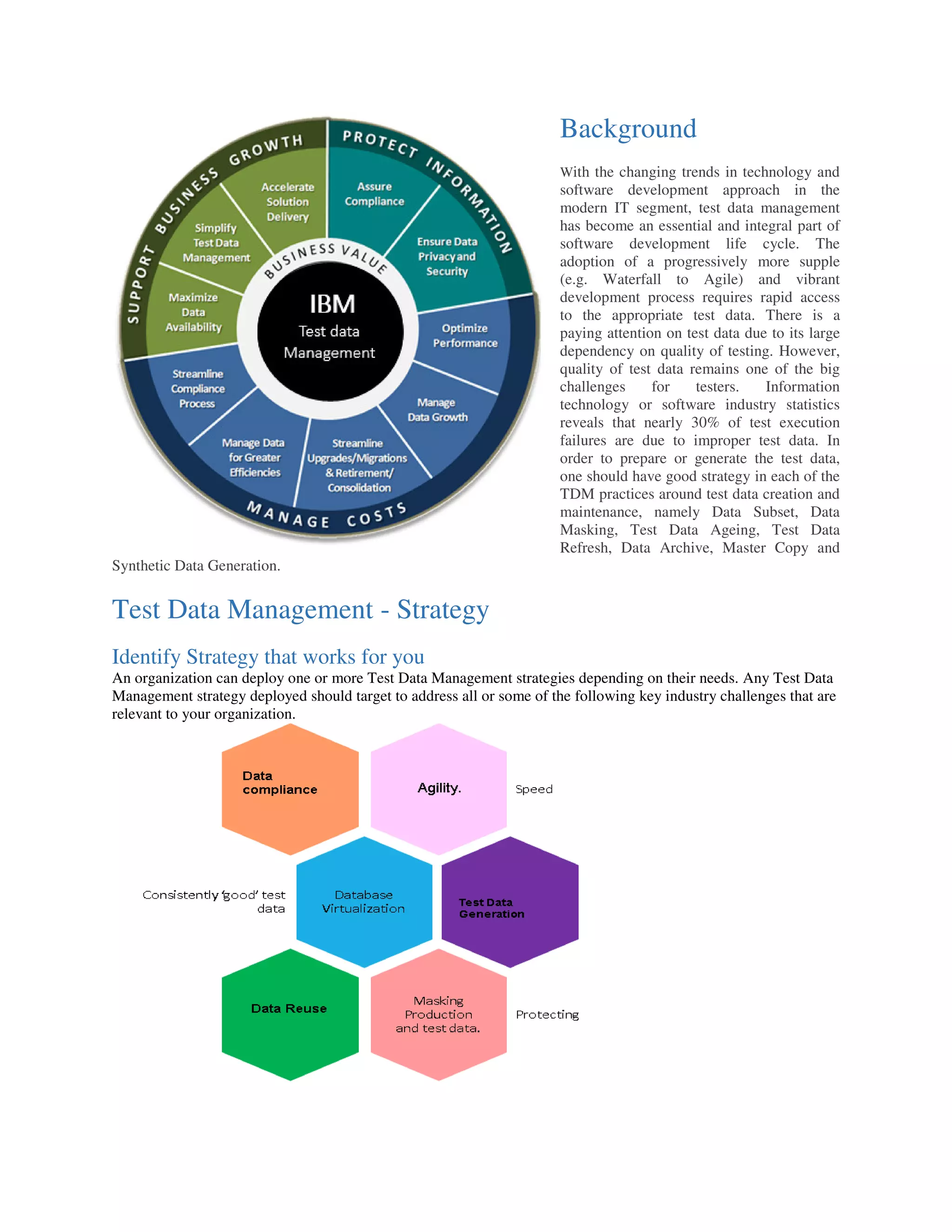 This document discusses test data management strategies and IBM's approach. It begins by explaining how test data management has become essential for software development. A key challenge is ensuring high quality test data. The document then outlines goals for a test data management strategy, such as producing reusable, consumable, and scalable results. It proposes analyzing needs, crafting data models, and establishing governance. IBM's approach involves engaging consultants, conducting a proof of concept, piloting the strategy, and full implementation using test data management tools. The overall goal is to improve testing efficiency and effectiveness.