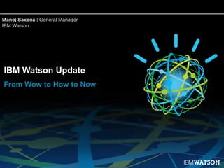The document presents an overview of IBM Watson's evolution, emphasizing its rapid development since 2006 and key milestones in healthcare and financial services. It highlights Watson's capabilities in data analysis, natural language understanding, and its significant impact on improving cancer treatment processes and outcomes. With a focus on cloud delivery and innovative business models, Watson is positioned as a transformative technology in various industries.