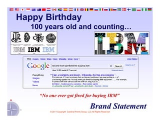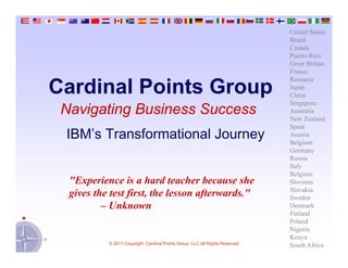 This document discusses IBM's transformational journey from 1993 to 2010. It summarizes that IBM transitioned from a hardware-focused company generating 49% of revenue from hardware in 1993 to a services-focused company generating 57% of revenue from services in 2010. It also notes that IBM acquired over 116 companies since 2002 to transform its business mix, divested some business units, and saw its revenue grow 59% to nearly $100 billion over this period.