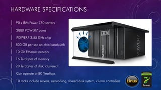 The document outlines IBM's Watson, a cognitive computing system developed to answer questions posed in natural language, famously showcased on the quiz show 'Jeopardy!'. It details Watson's hardware specifications, technology architecture, its development timeline, and capabilities in utilizing machine learning and data analysis. Additionally, it highlights Watson's applications across various fields, its limitations, and concludes with its competitive performance against human players.