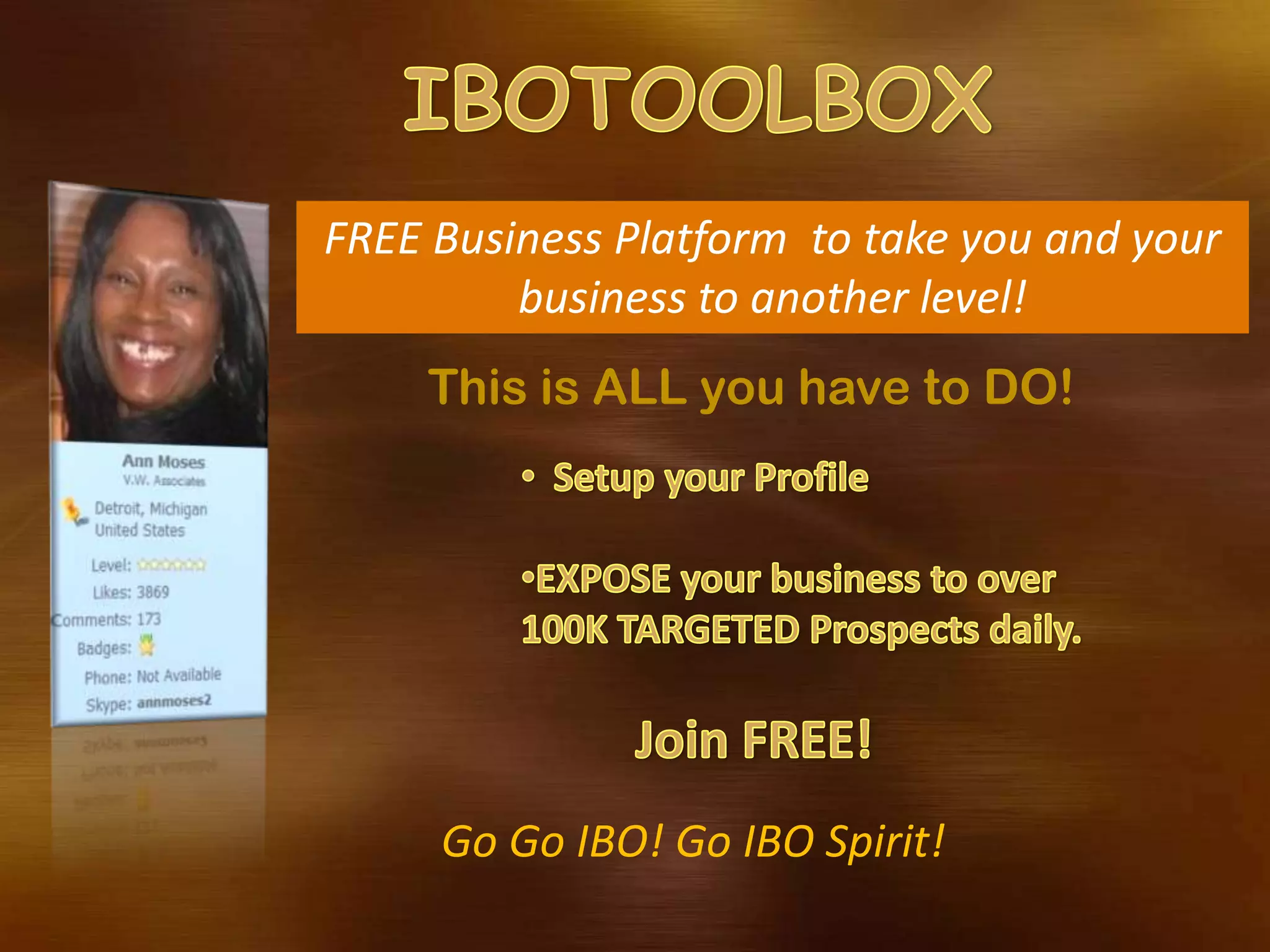 The document promotes a free business platform that can take a business to another level, stating that all one has to do is go with the IBO spirit. Guidelines are provided for formatting text, including font size and color, in slide masters as well as examples of slides with titles, subheads, charts, and templates for names, titles, and companies.