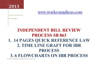 This document provides information about California's independent bill review process established under SB 863. It includes a quick reference guide to the rules governing the IBR process with 14 pages of content and timelines. The document also contains 6 flowcharts illustrating the steps in the IBR process. It was created by Richard Boggan, an attorney, as a reference for understanding how the IBR system works according to the emergency regulations.