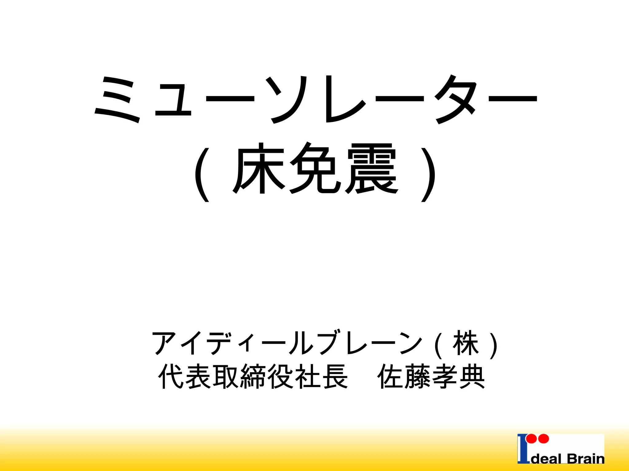 VIOPS01: ミューソレーター (床免震) アイディールブレーン株式会社 代表取締役社長 佐藤孝典 2008年8月21日(木曜日) 13:00-18:00 VIOPS01 WORKSHOP Virtualized Infrastructures Workshop [01]