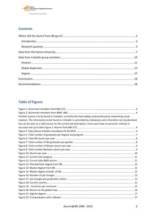 This document analyzes data from the Hanze University database and LinkedIn to summarize the careers of alumni from the International Business and Management School of Hanze University of Applied Sciences from 1990-2014. It finds that most alumni have international careers across a variety of industries, with about half obtaining a master's degree. The majority of alumni have remained professionally active, with some changing jobs multiple times. The data shows IBS alumni have dispersed globally to work in many countries across all continents.