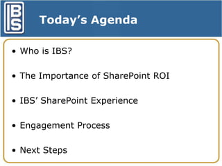 This document provides an overview of IBS' SharePoint capabilities and services. IBS is a $50 million privately held consulting firm with 200+ consultants across the US and development centers. They have extensive experience developing SharePoint solutions for clients across various industries. The document outlines IBS' development process, which uses an iterative approach with client involvement to deliver SharePoint solutions that meet requirements and have user acceptance. Examples of solutions include intranets, portals, task management, and custom applications like inspections. The presentation concludes by inviting the client to next steps in an engagement.